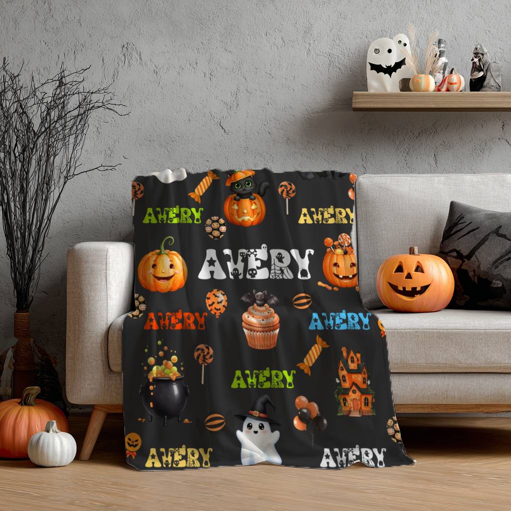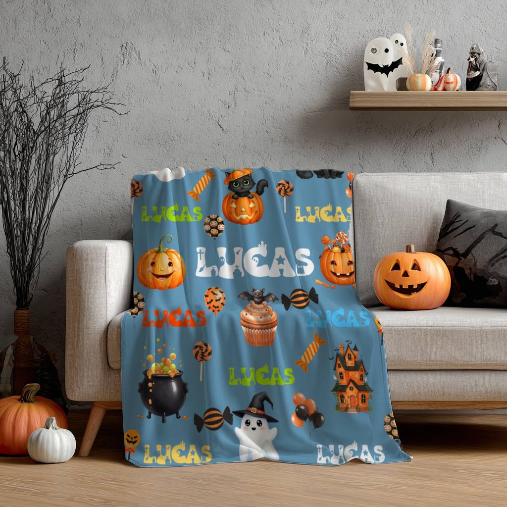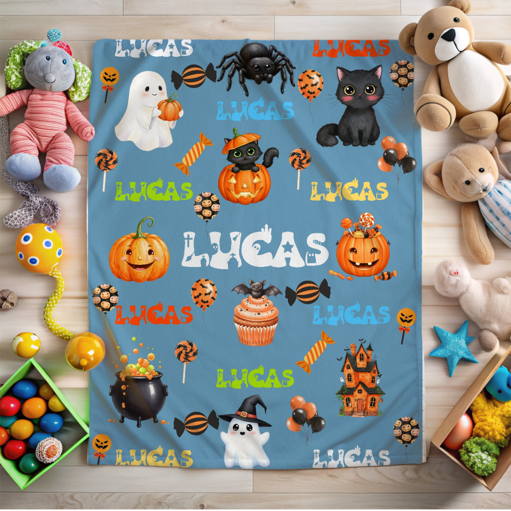Add spooky fun and cozy warmth to your child’s room with this personalized Halloween blanket featuring pumpkins, ghosts, and bats-perfect for little ones who love festive adventures, playful spooks, and cozy snuggles.