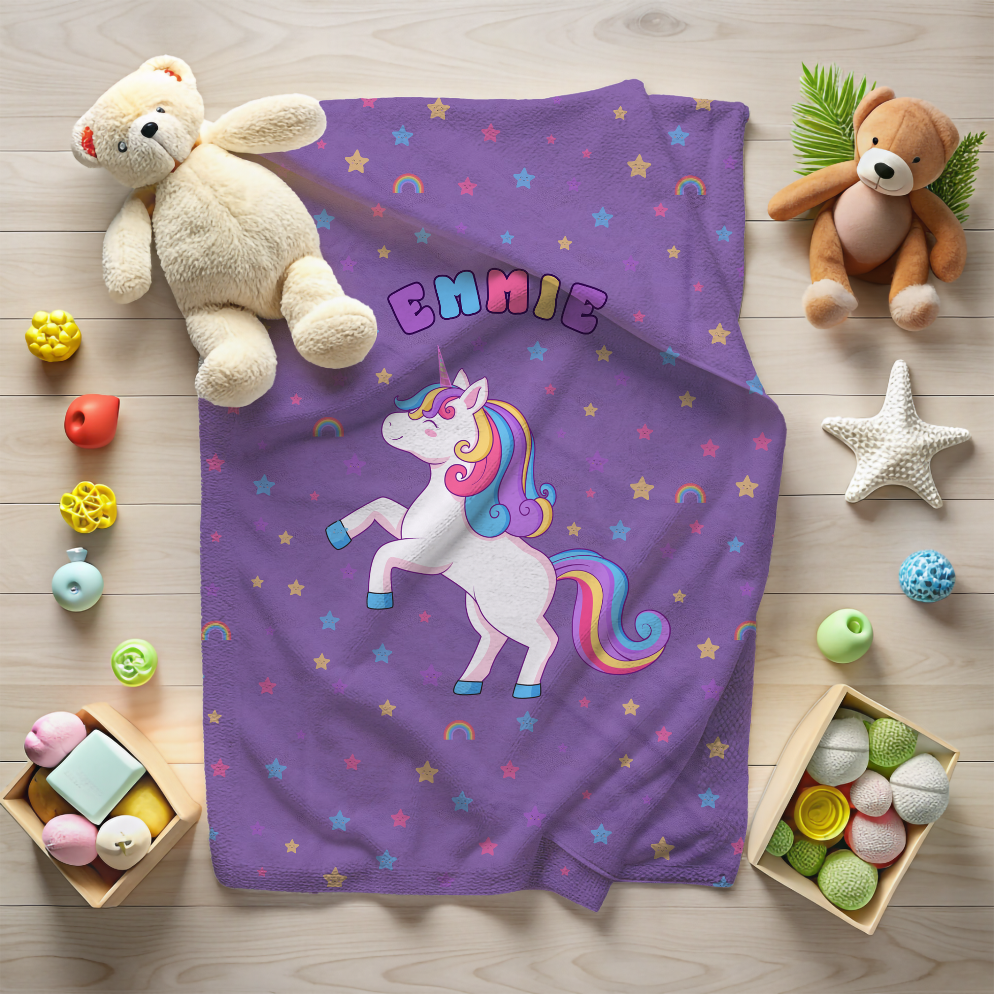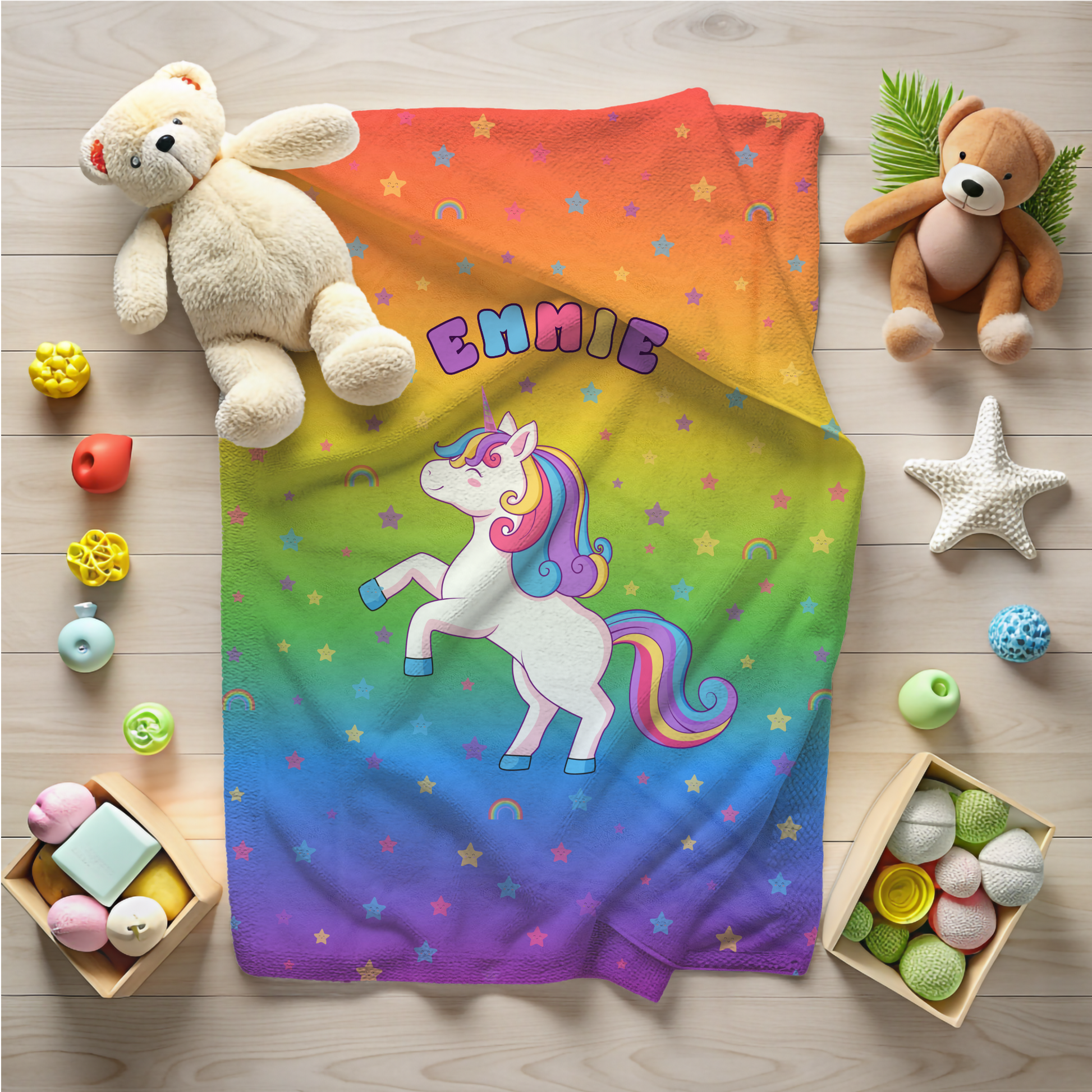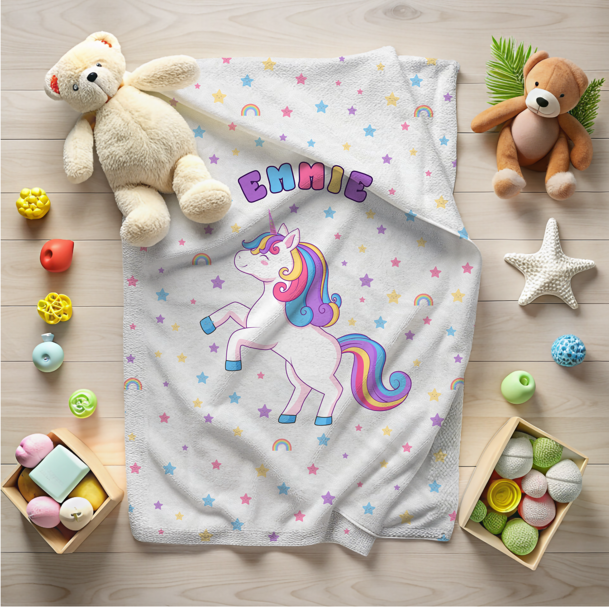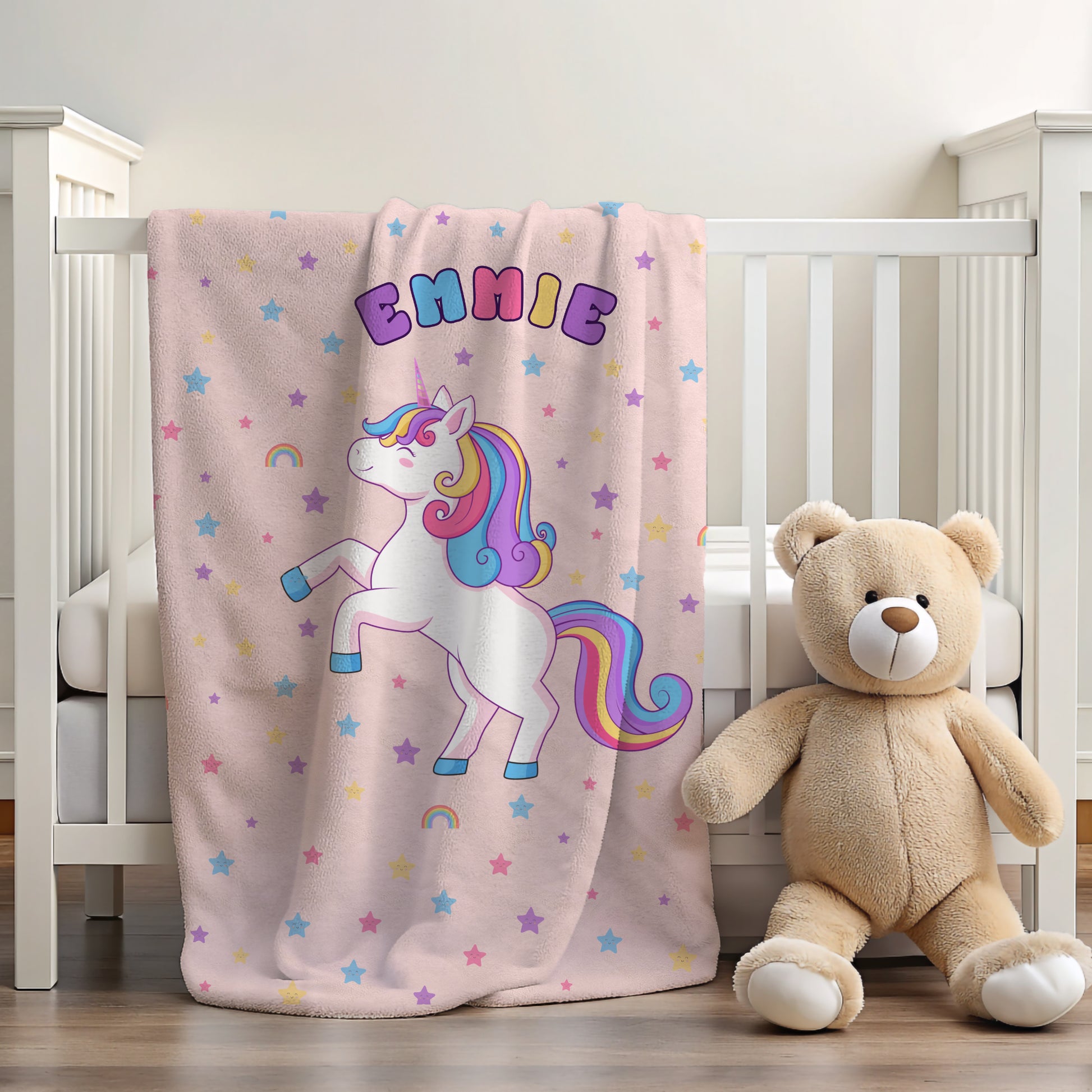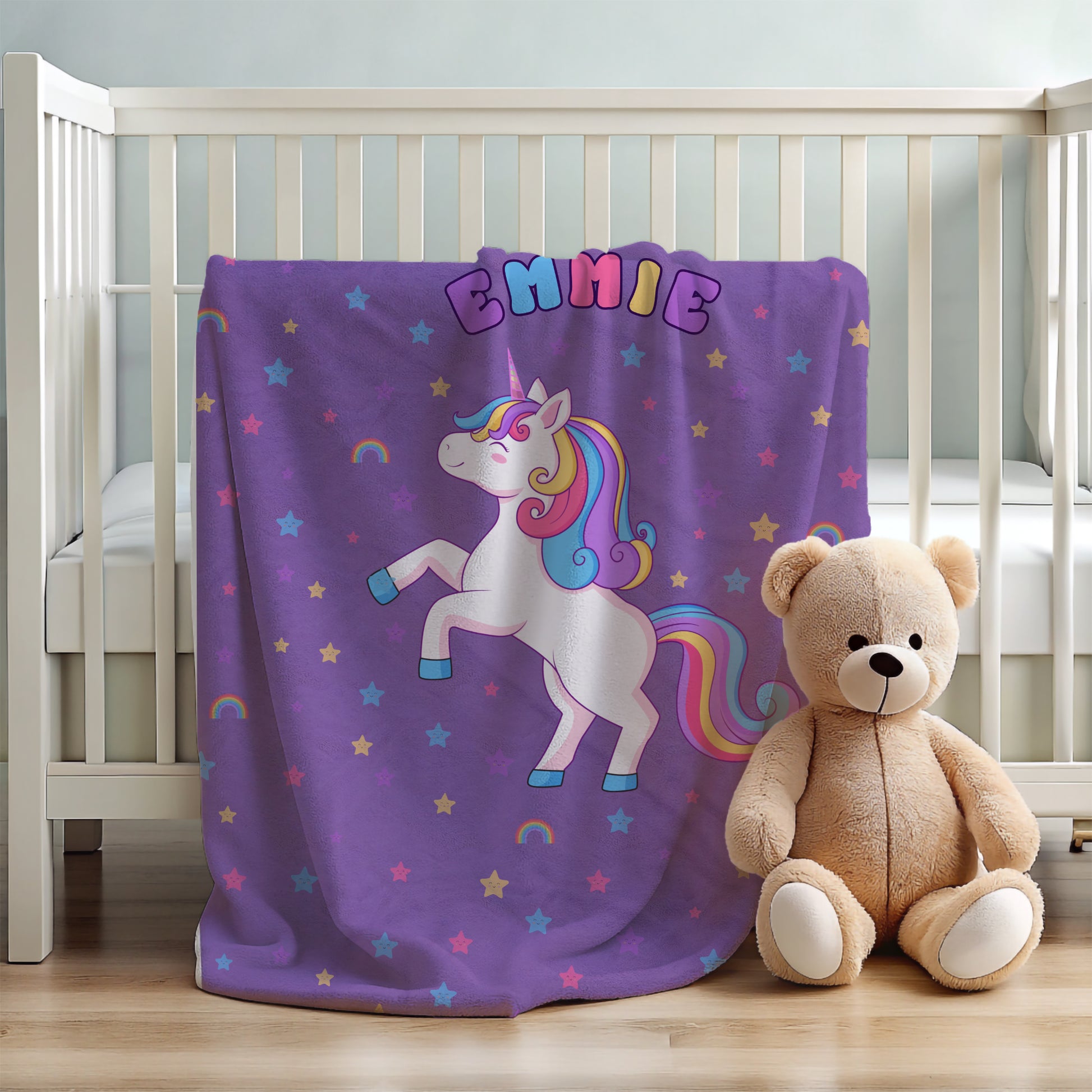 Add magic and warmth to your child's room with this personalized unicorn blanket with rainbows and stars, perfect for little dreamers who love adventure, magic, and cozy snuggles.
