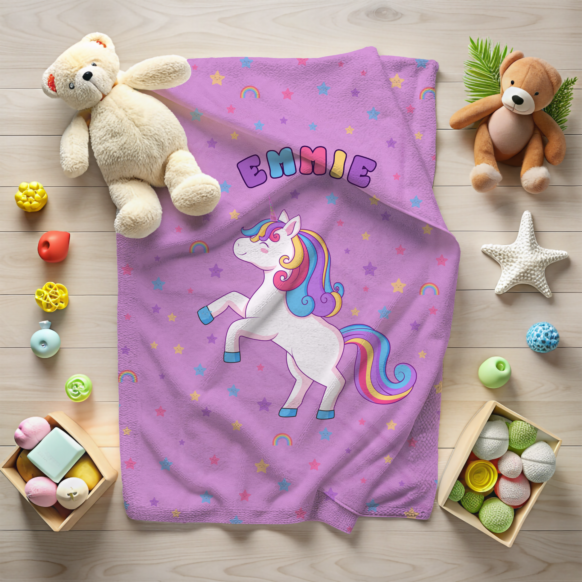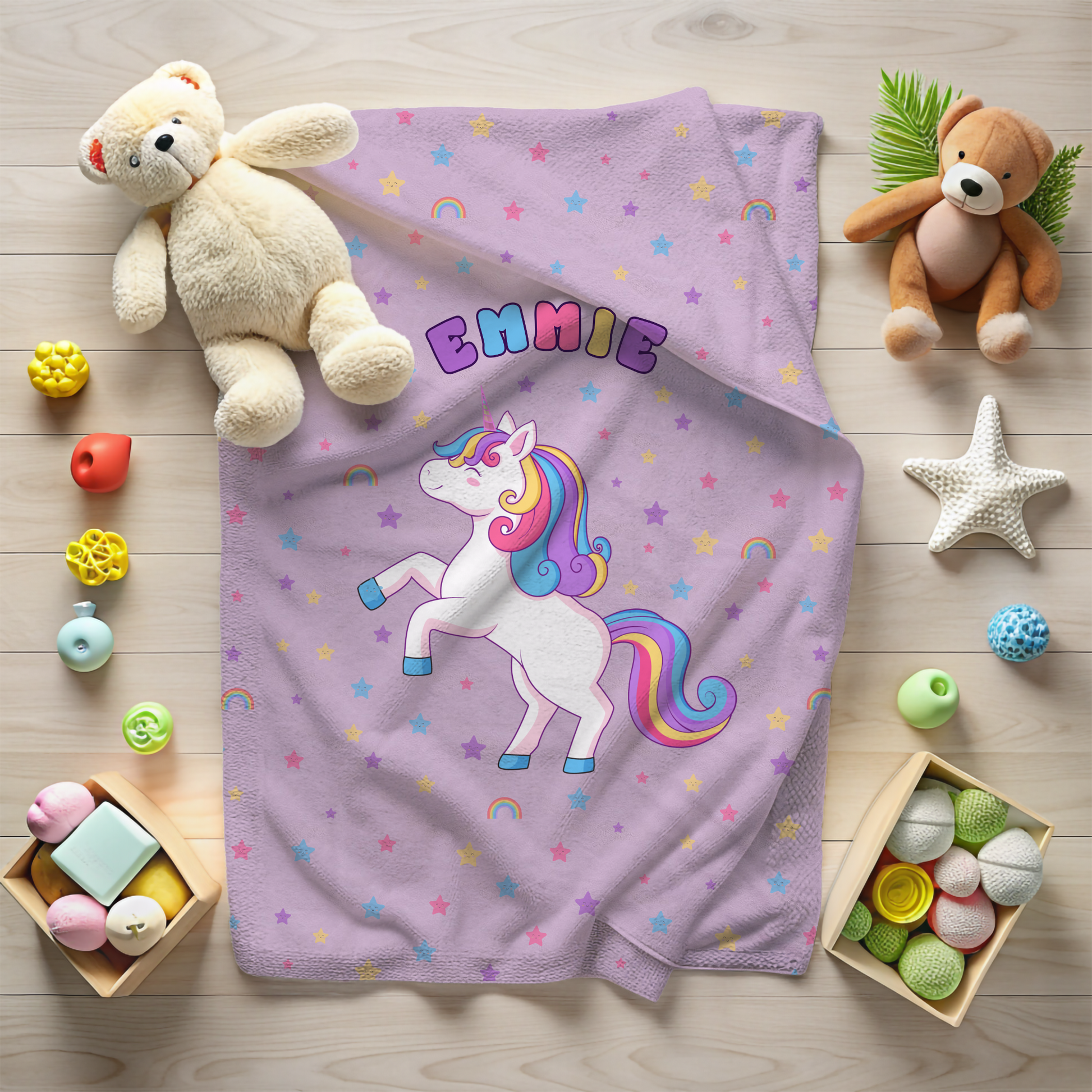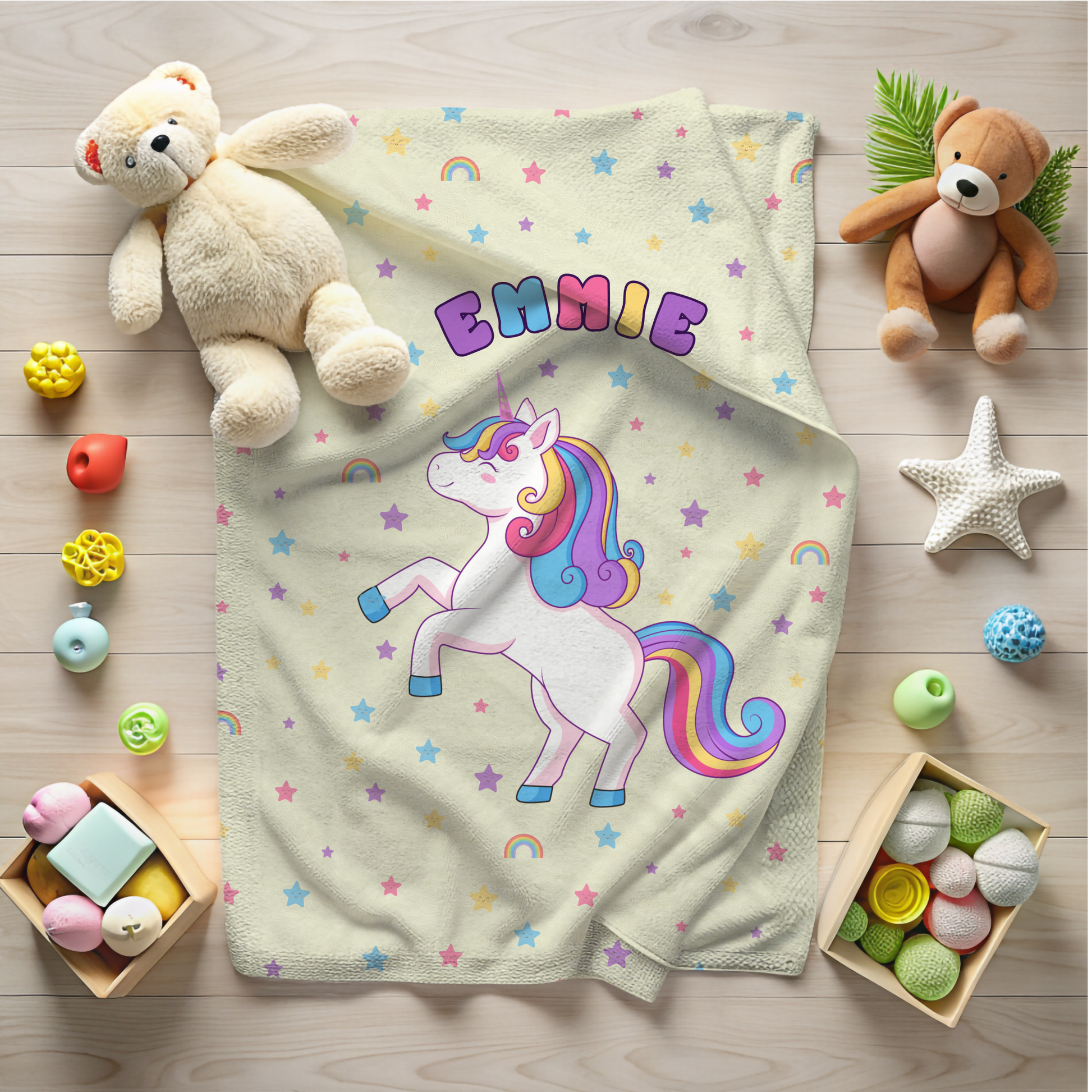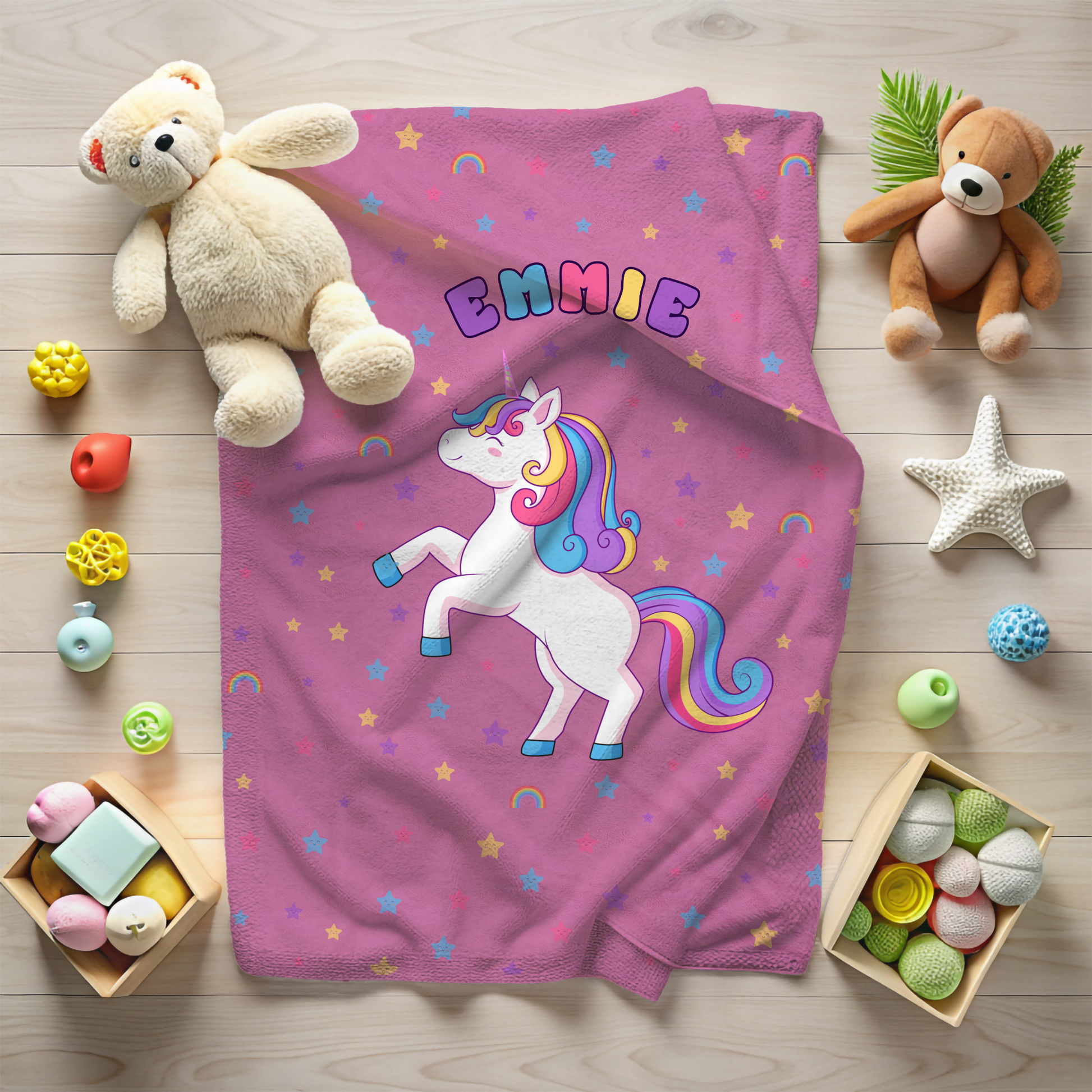 Add magic and warmth to your child's room with this personalized unicorn blanket with rainbows and stars, perfect for little dreamers who love adventure, magic, and cozy snuggles.