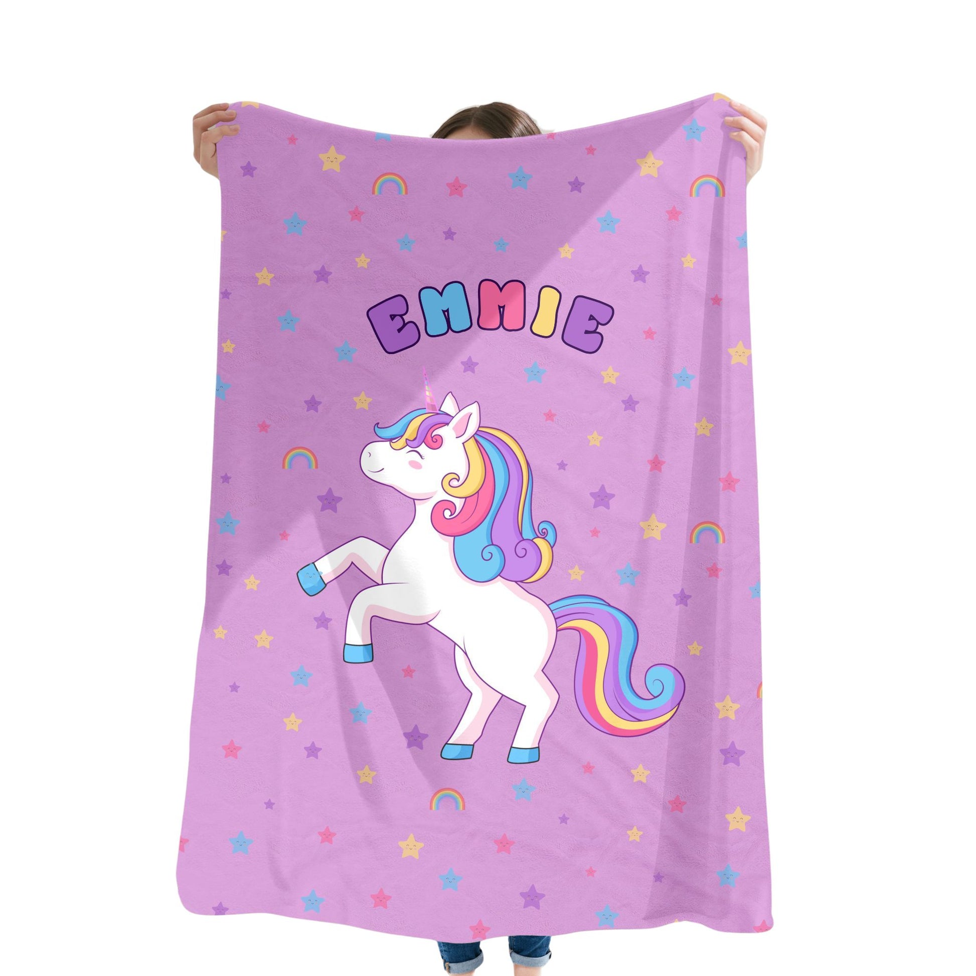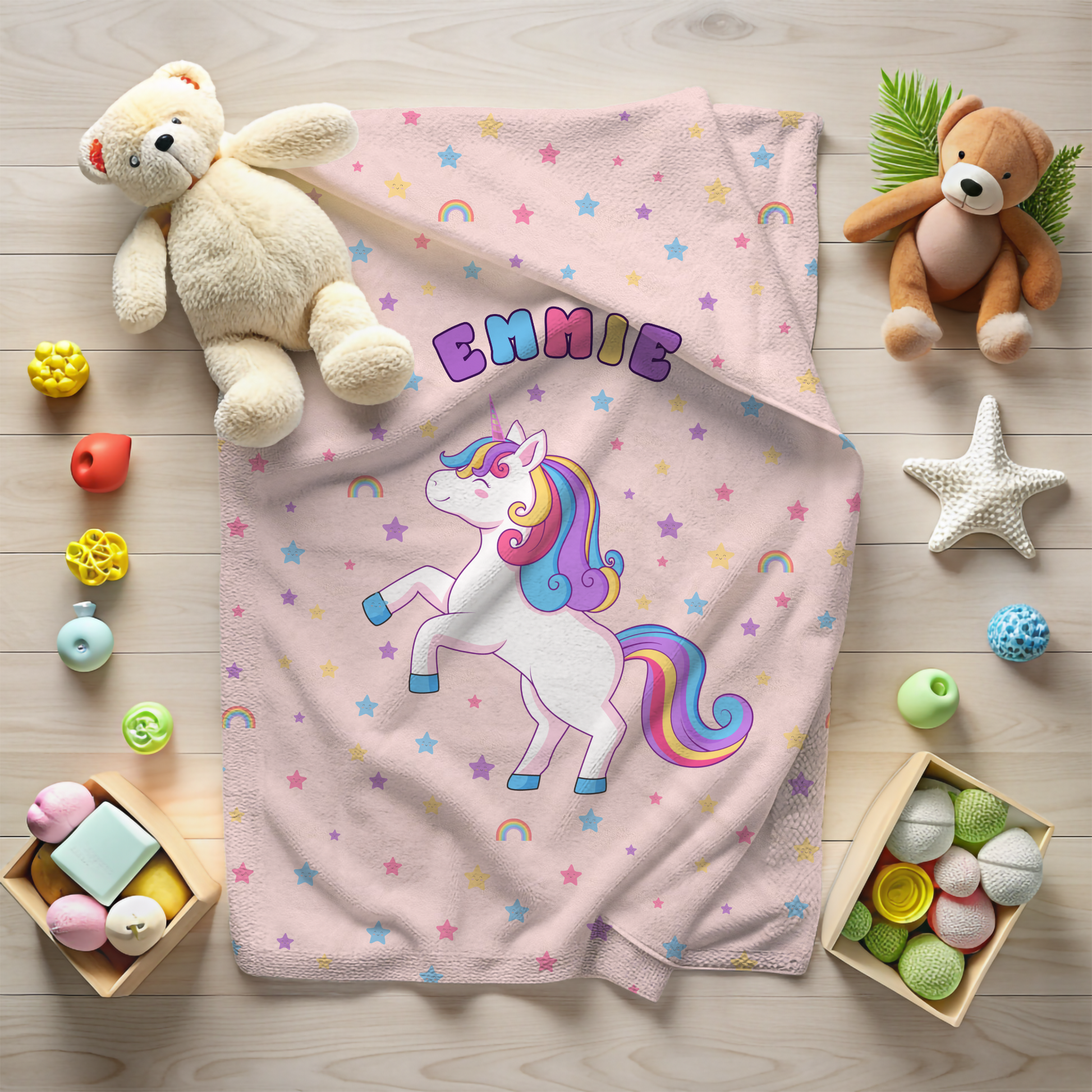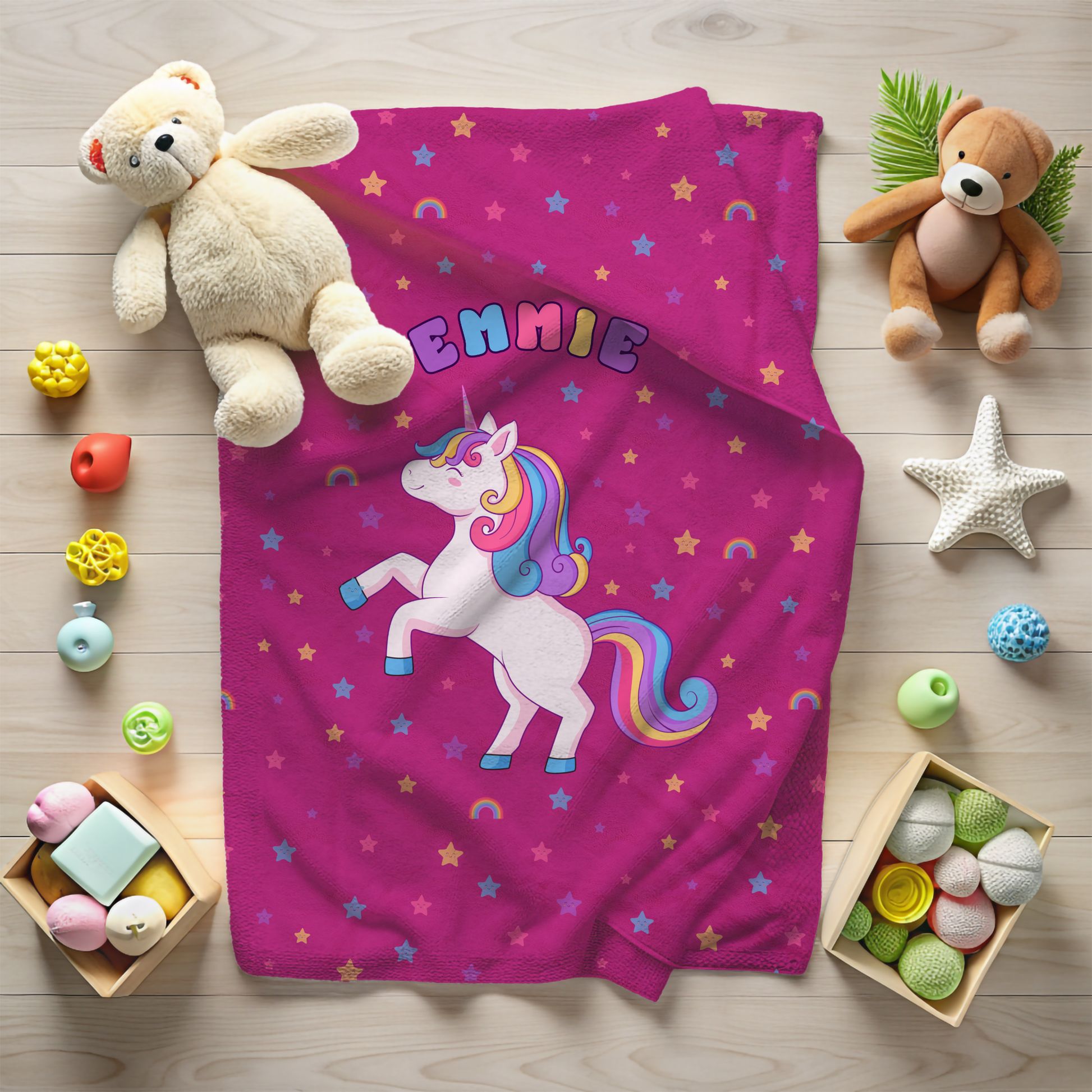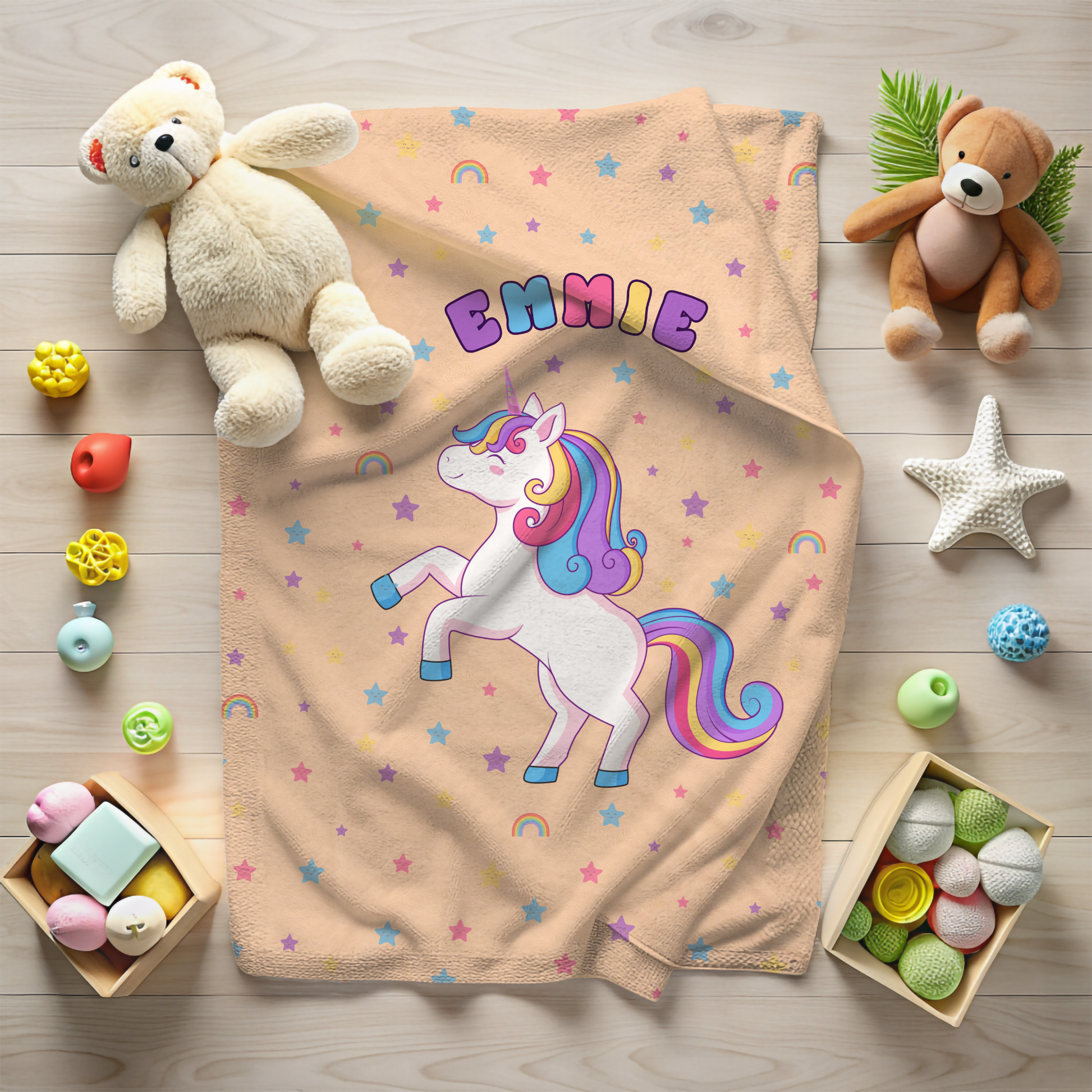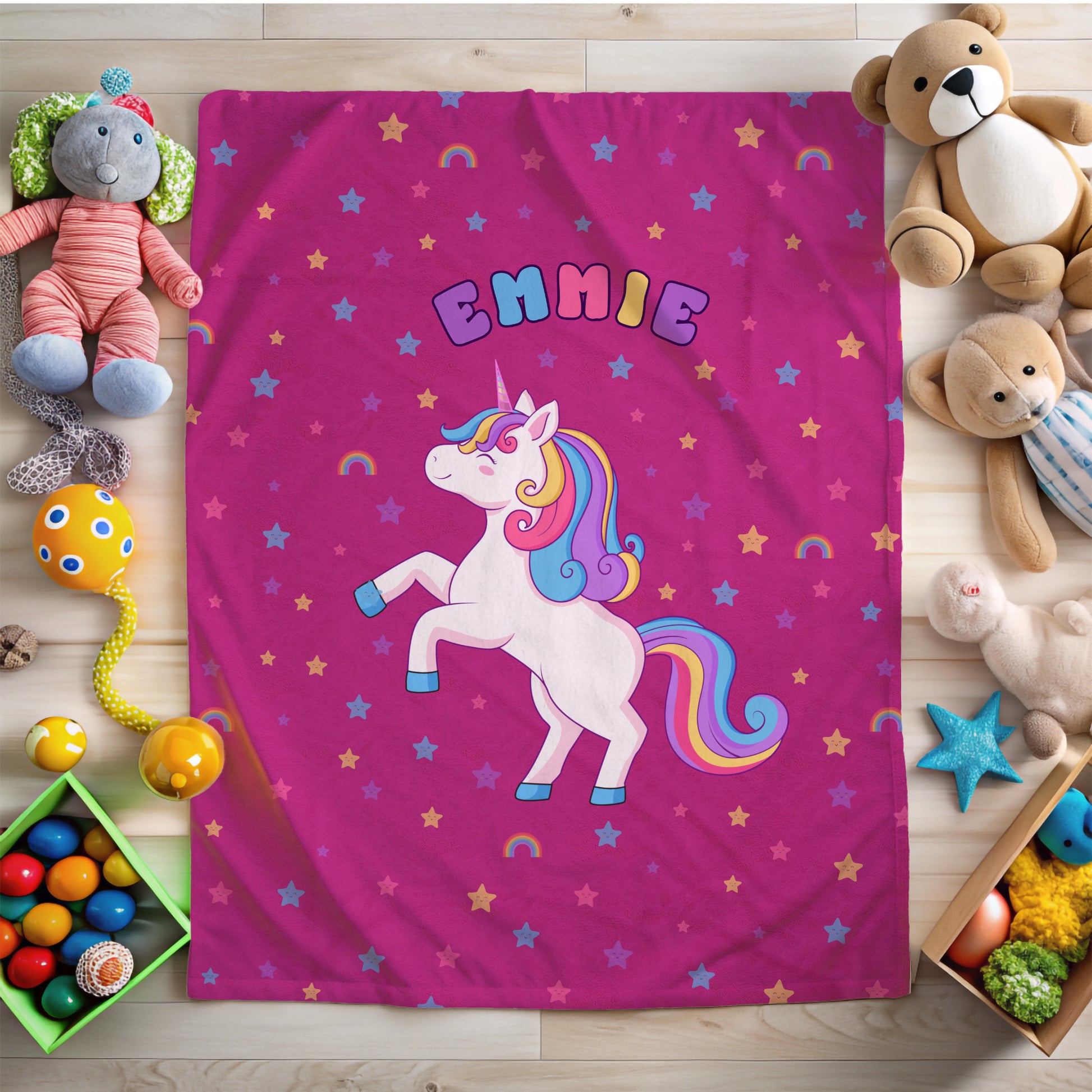 Add magic and warmth to your child's room with this personalized unicorn blanket with rainbows and stars, perfect for little dreamers who love adventure, magic, and cozy snuggles.