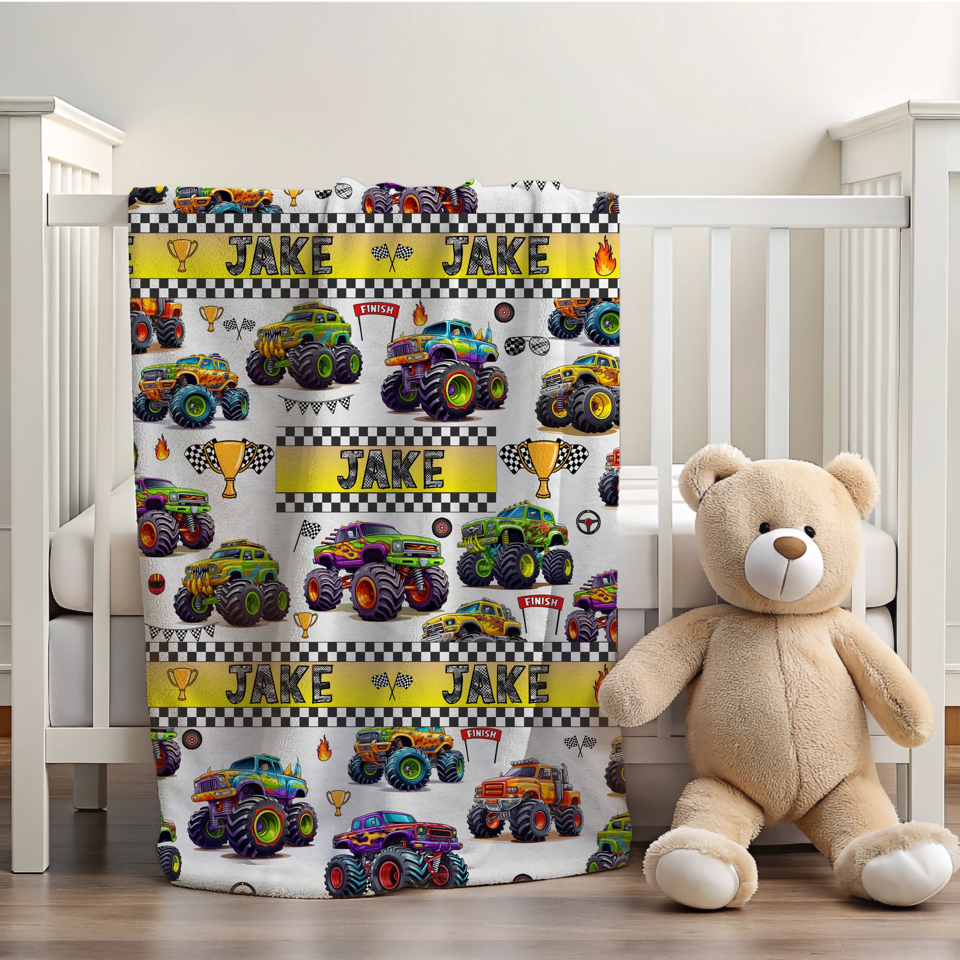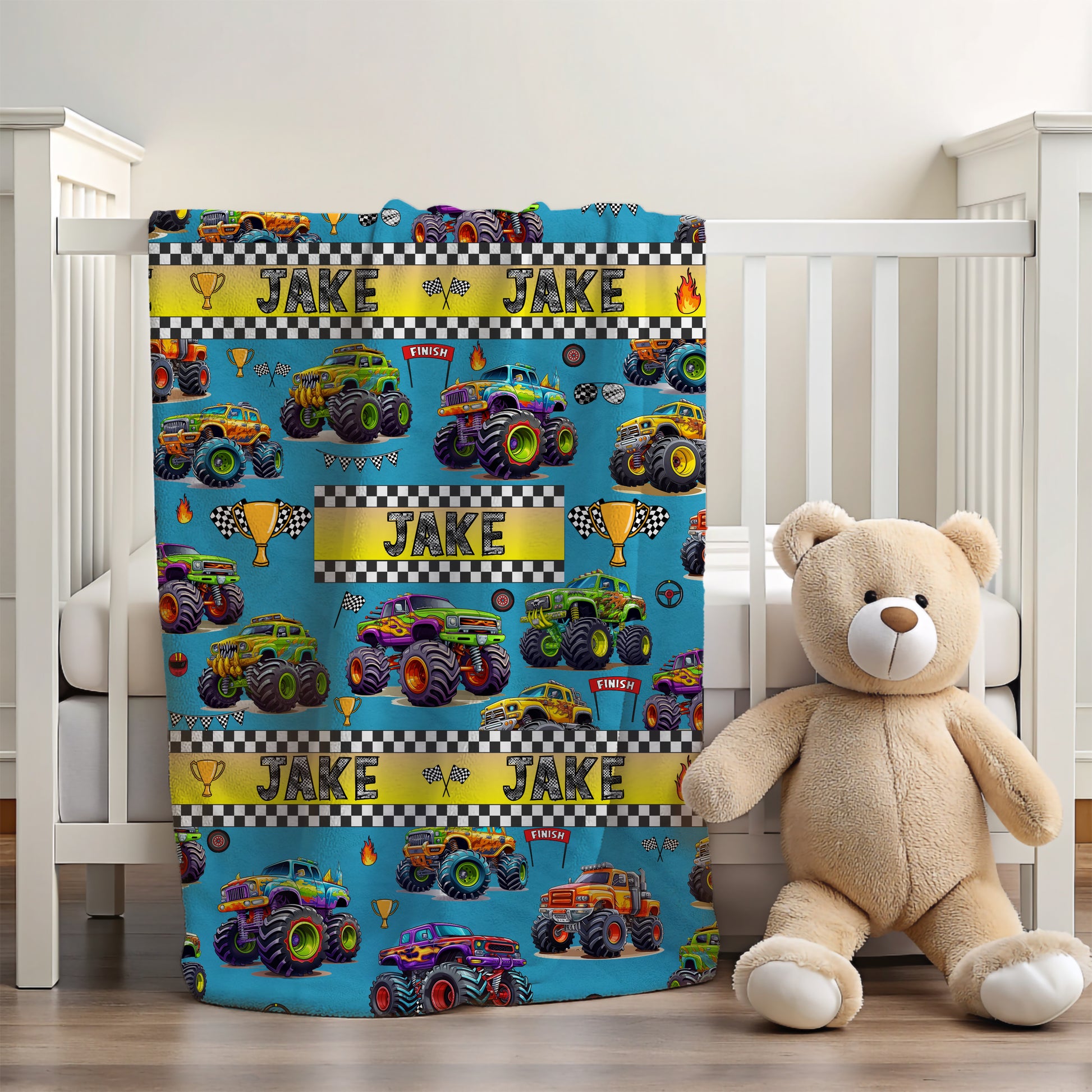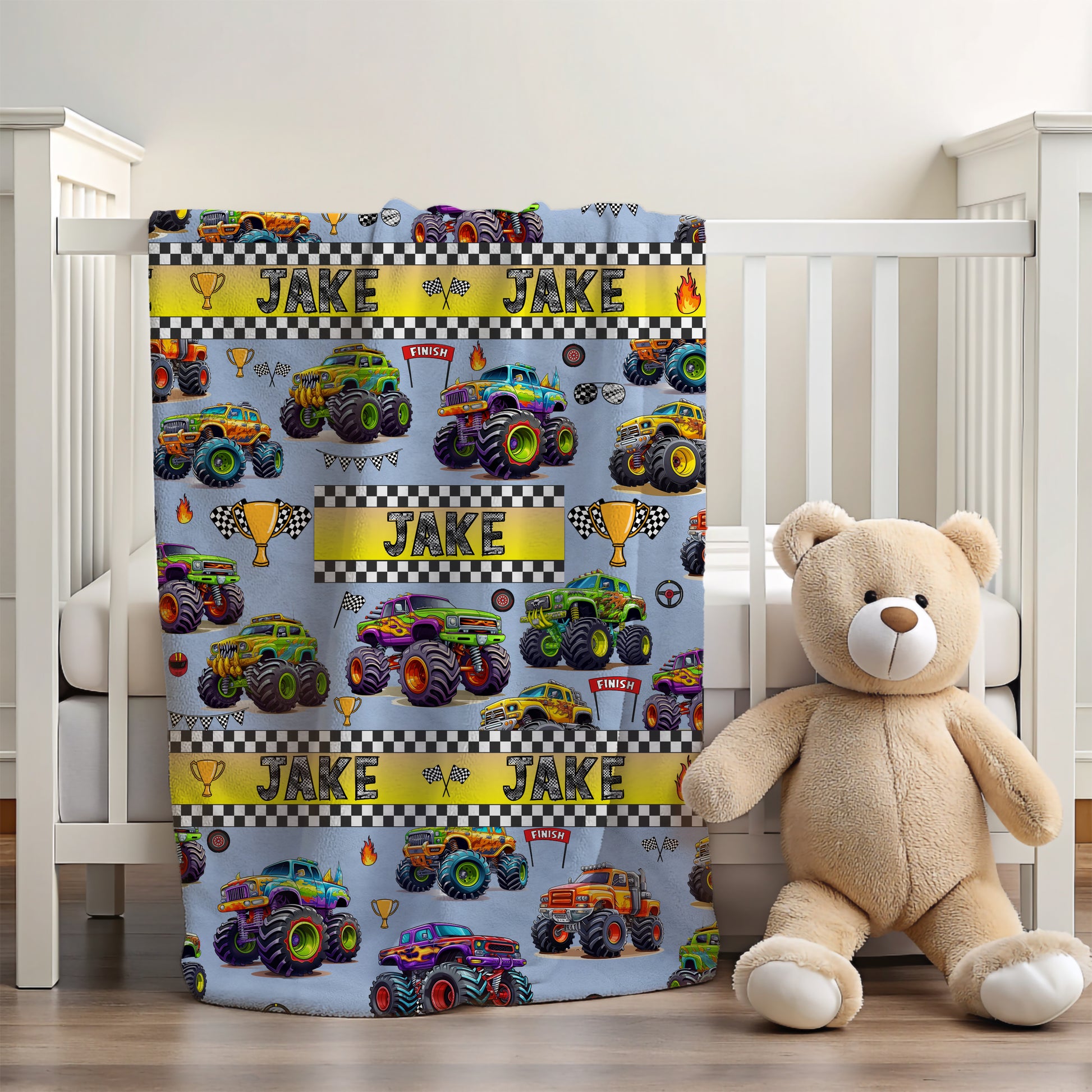 Bring excitement and warmth to your child’s bedtime with this personalized monster truck blanket, perfect for boys who love trucks, adventure, and cozy snuggles.