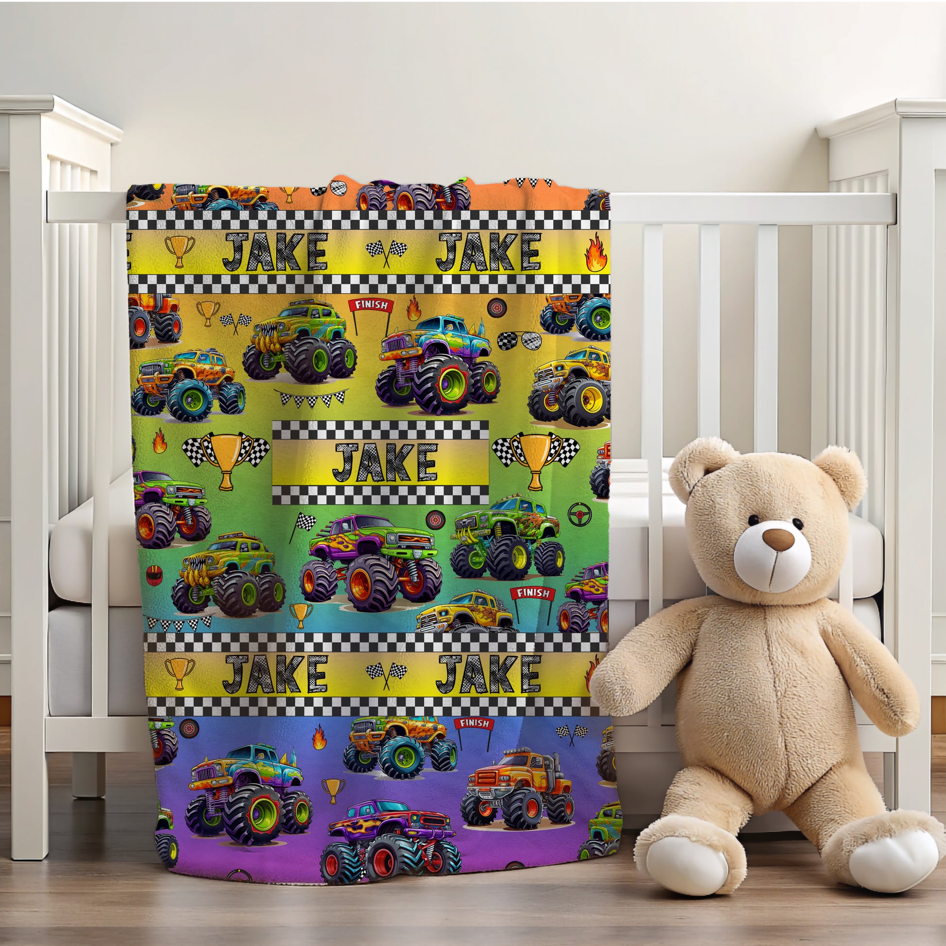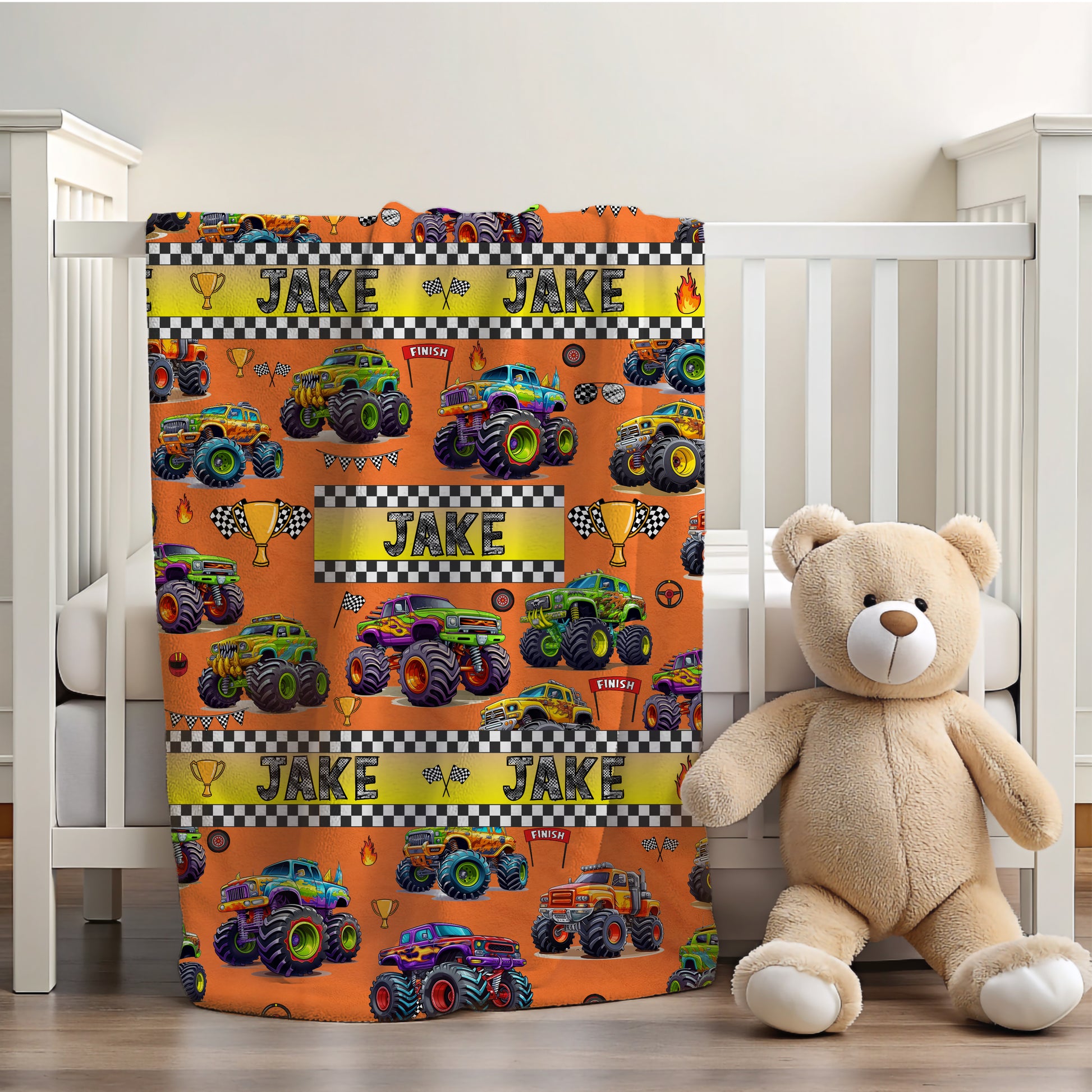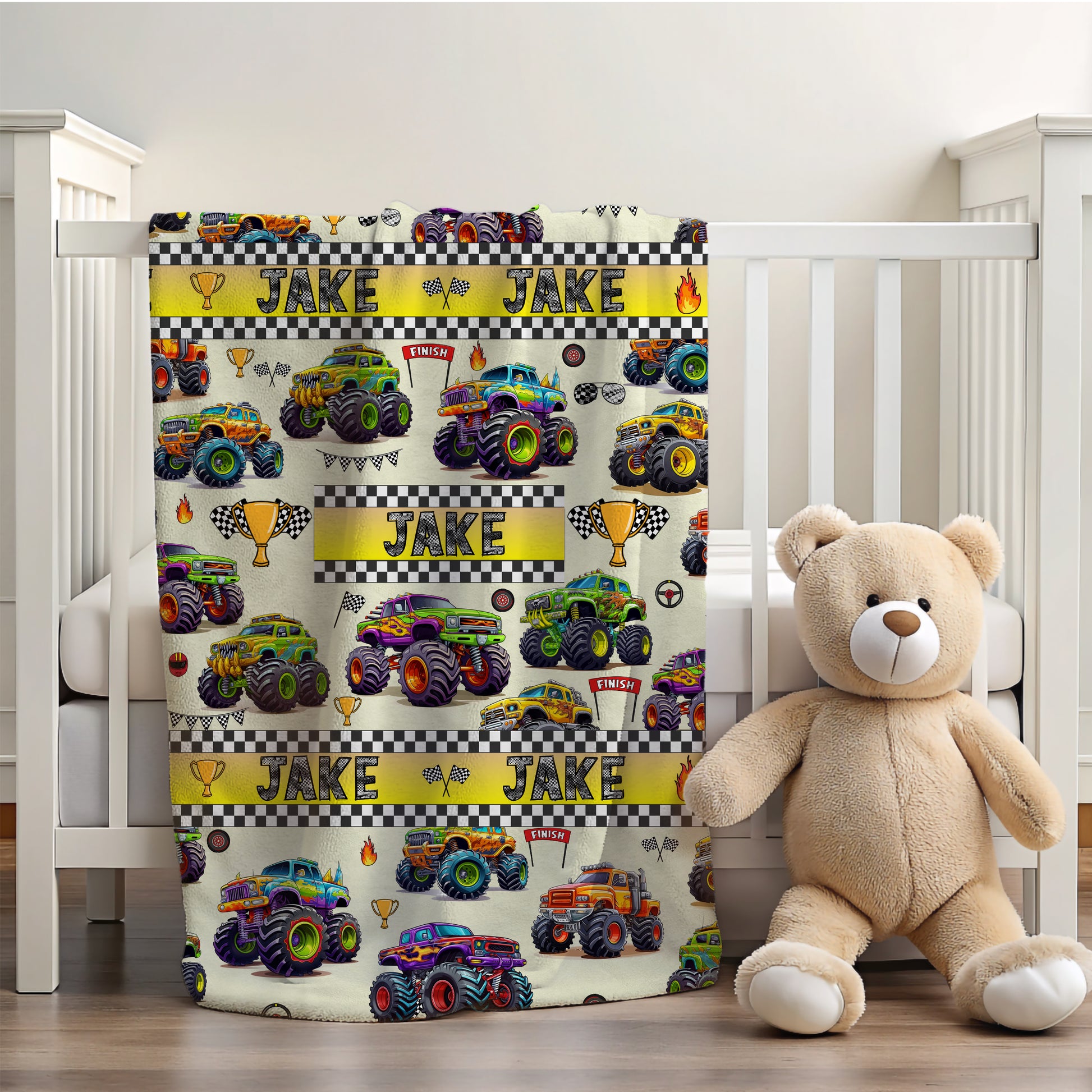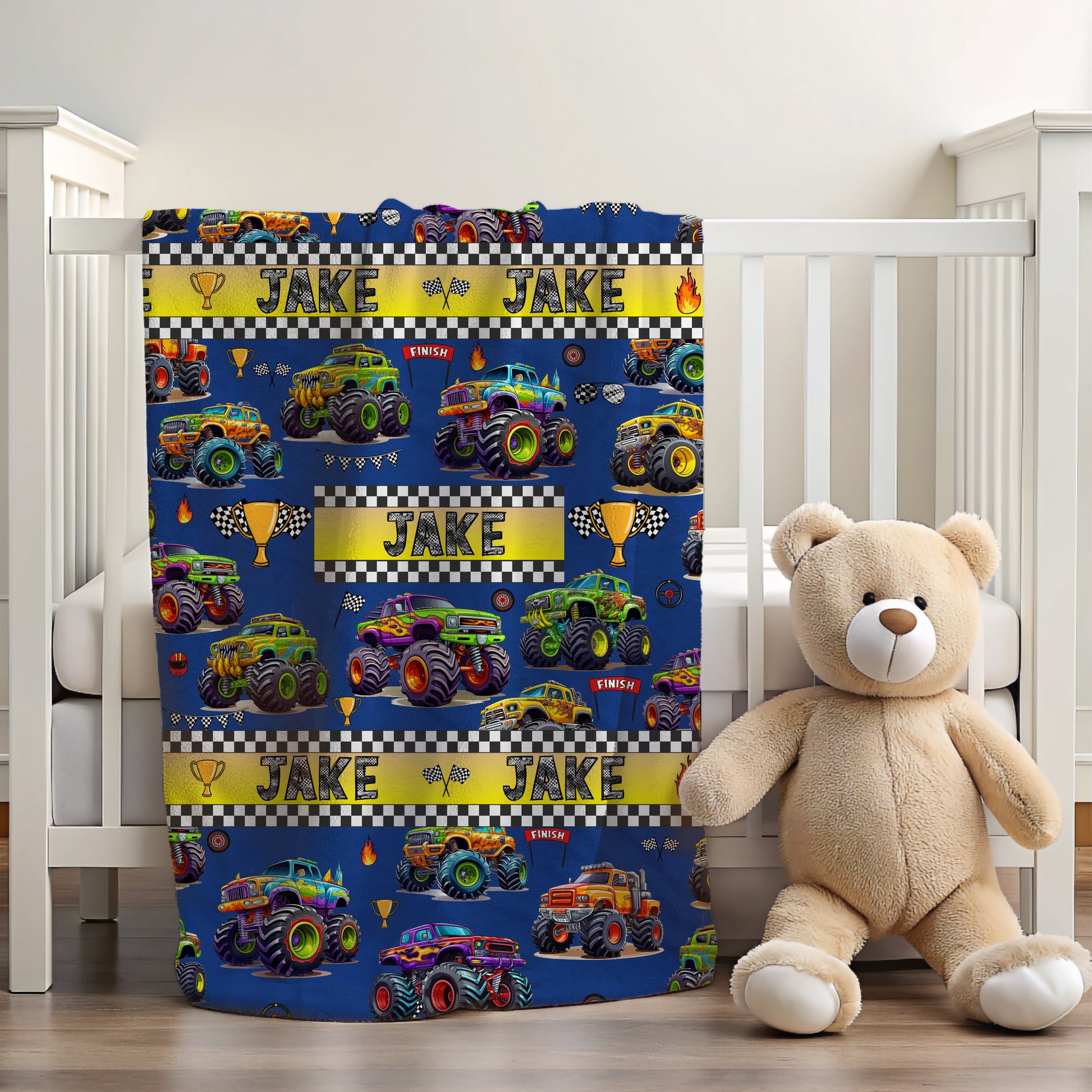 Bring excitement and warmth to your child’s bedtime with this personalized monster truck blanket, perfect for boys who love trucks, adventure, and cozy snuggles.