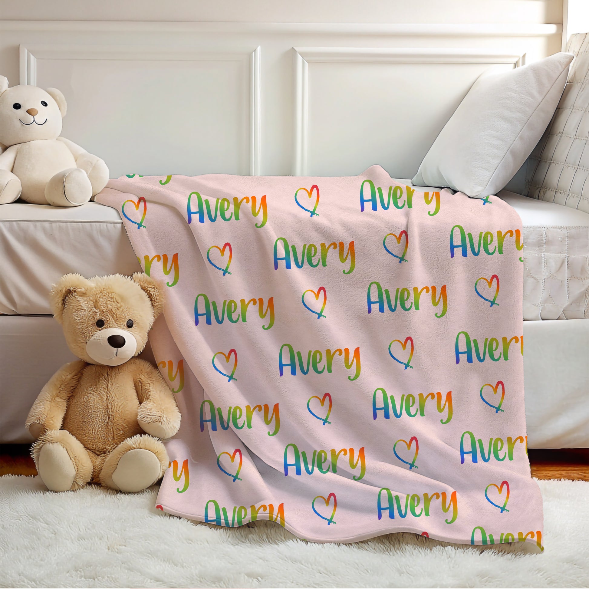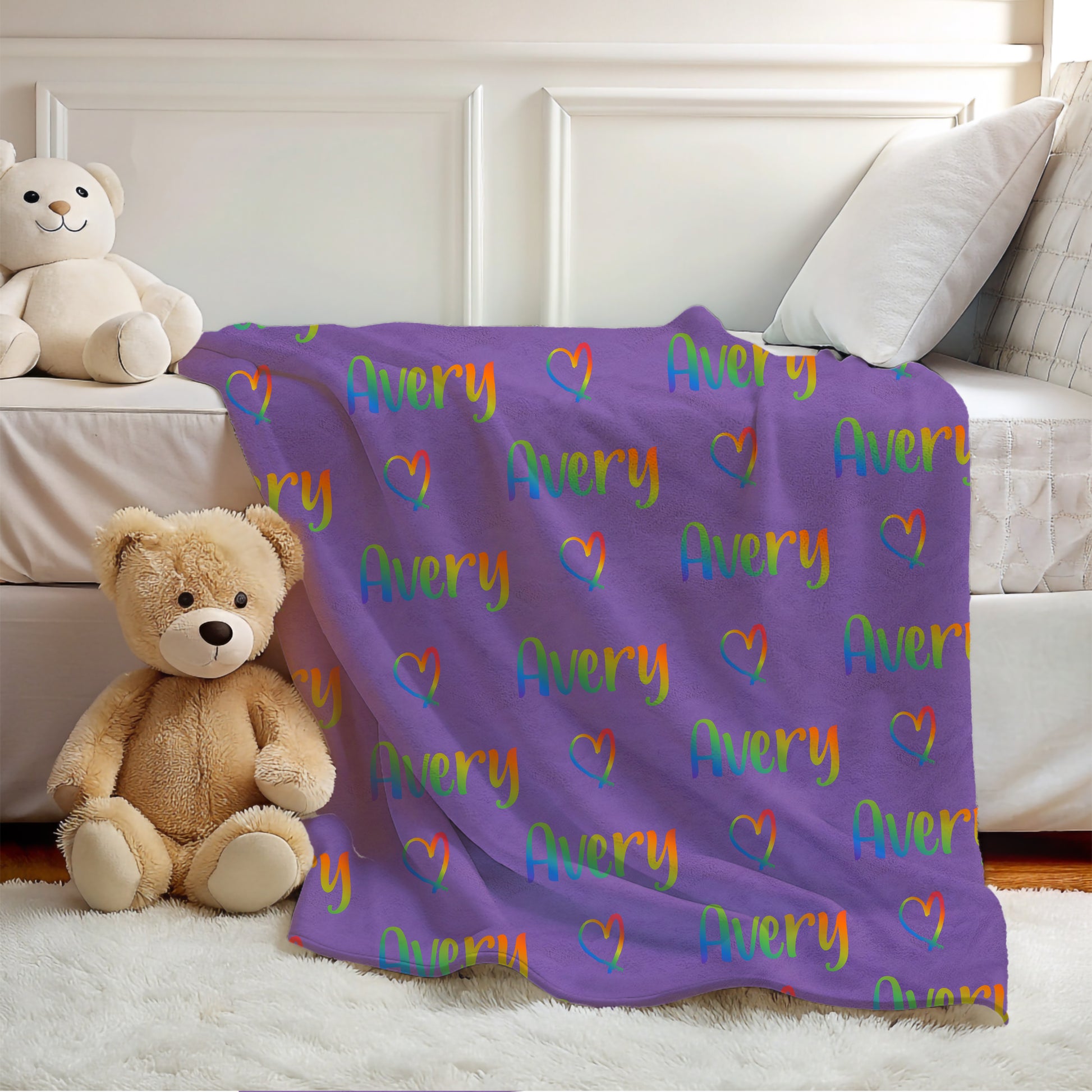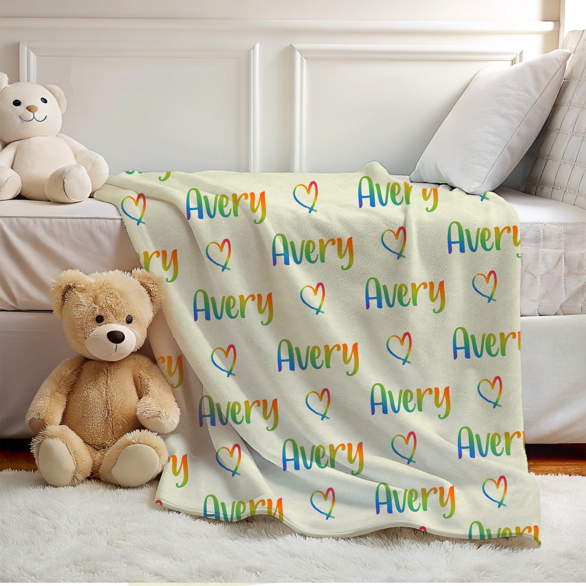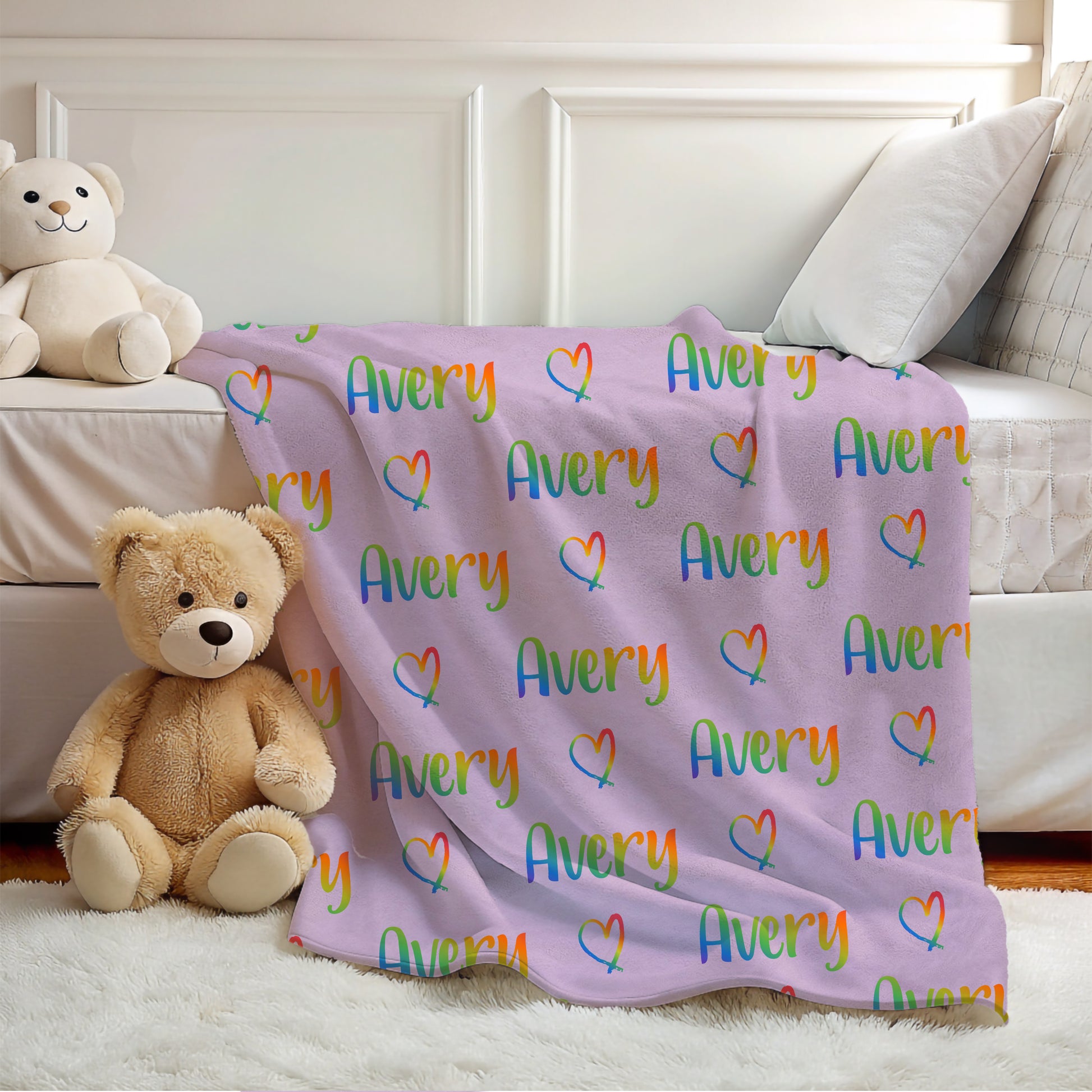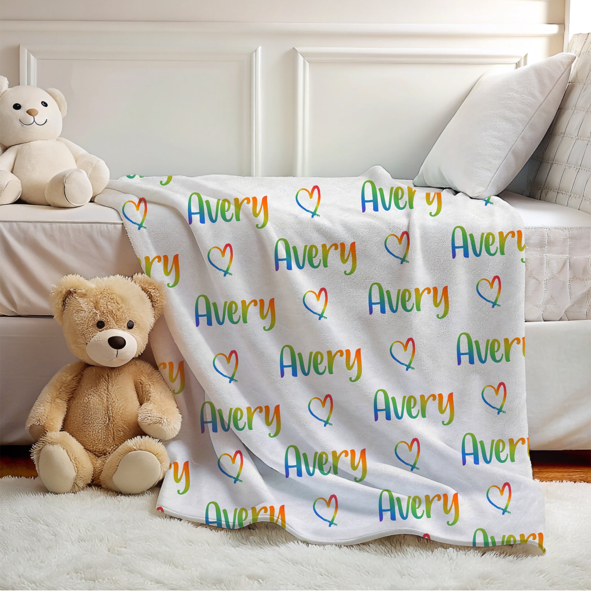 Add color and warmth to your child's room with this personalized rainbow name blanket, perfect for boys and girls who love vibrant colors and cozy snuggles.