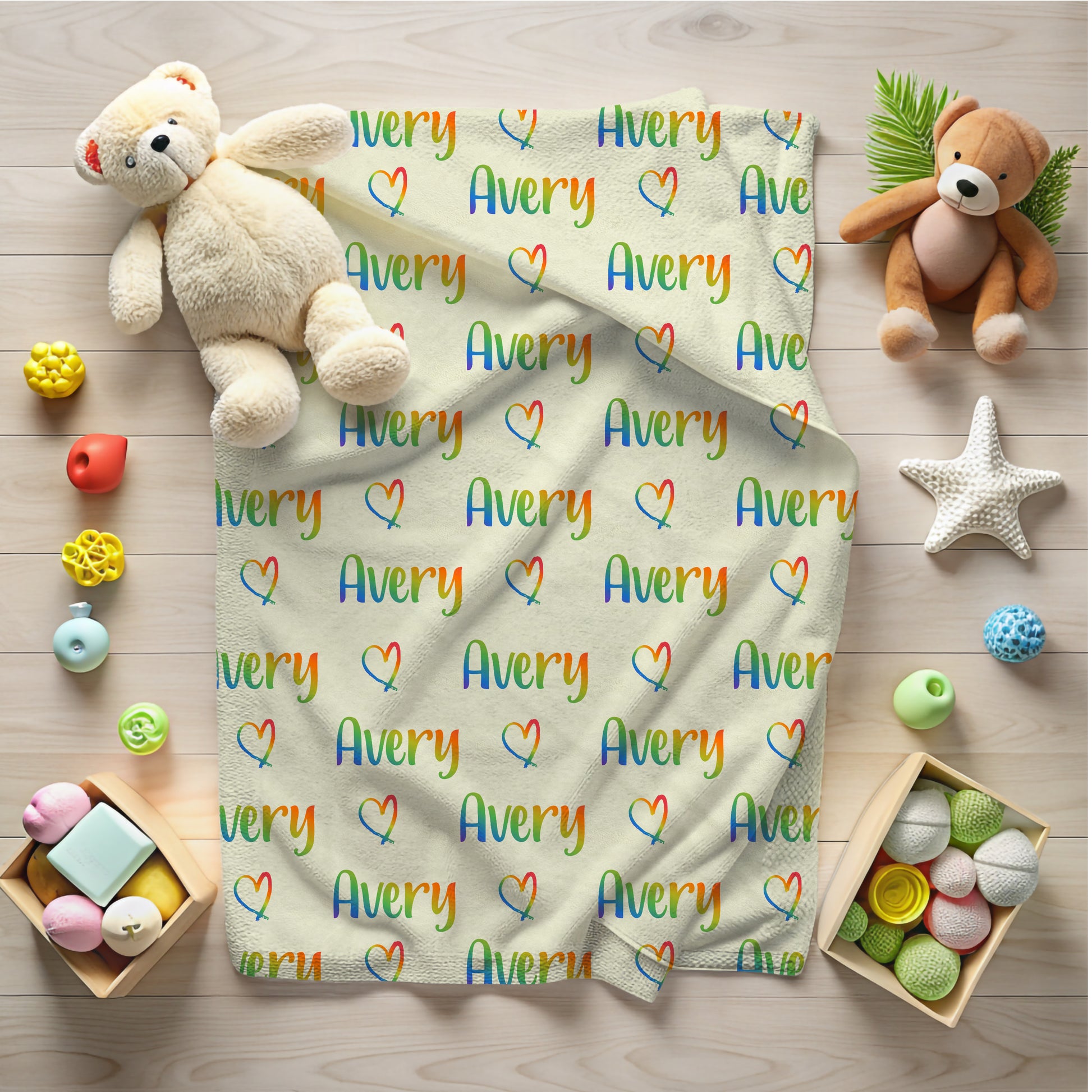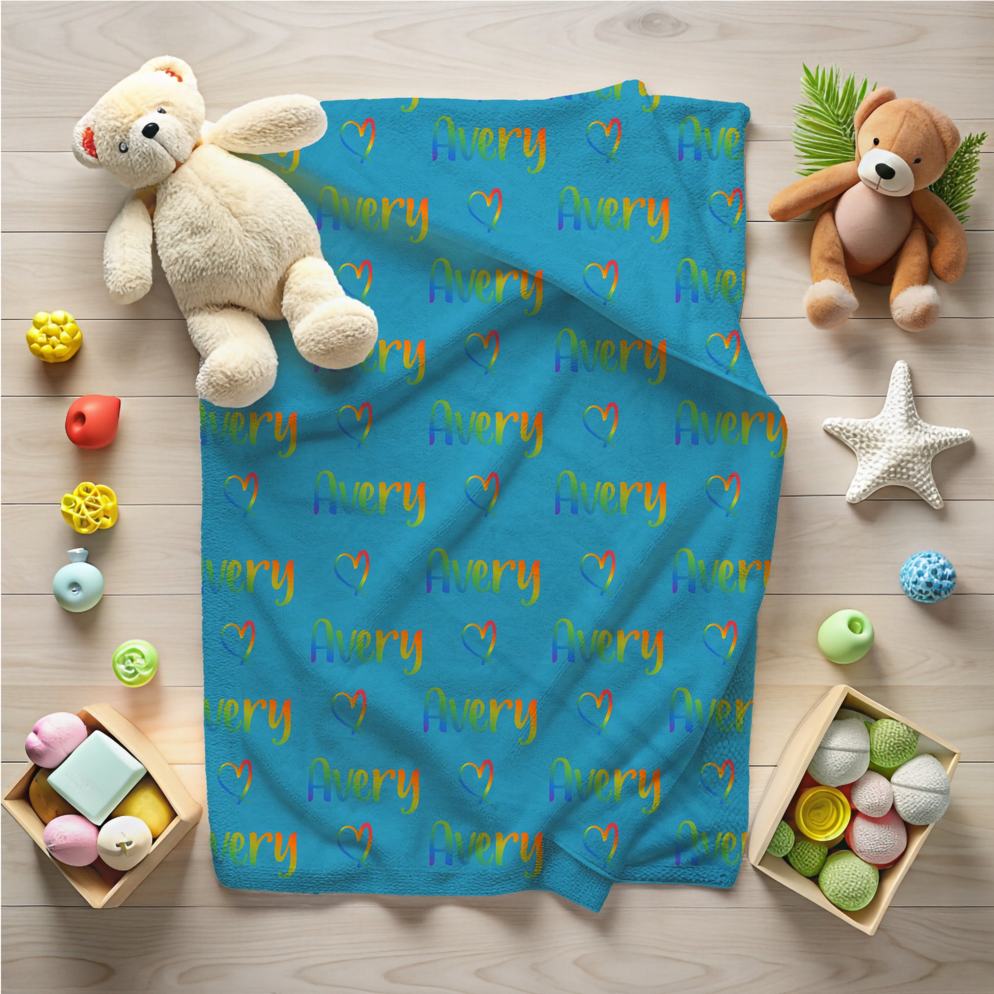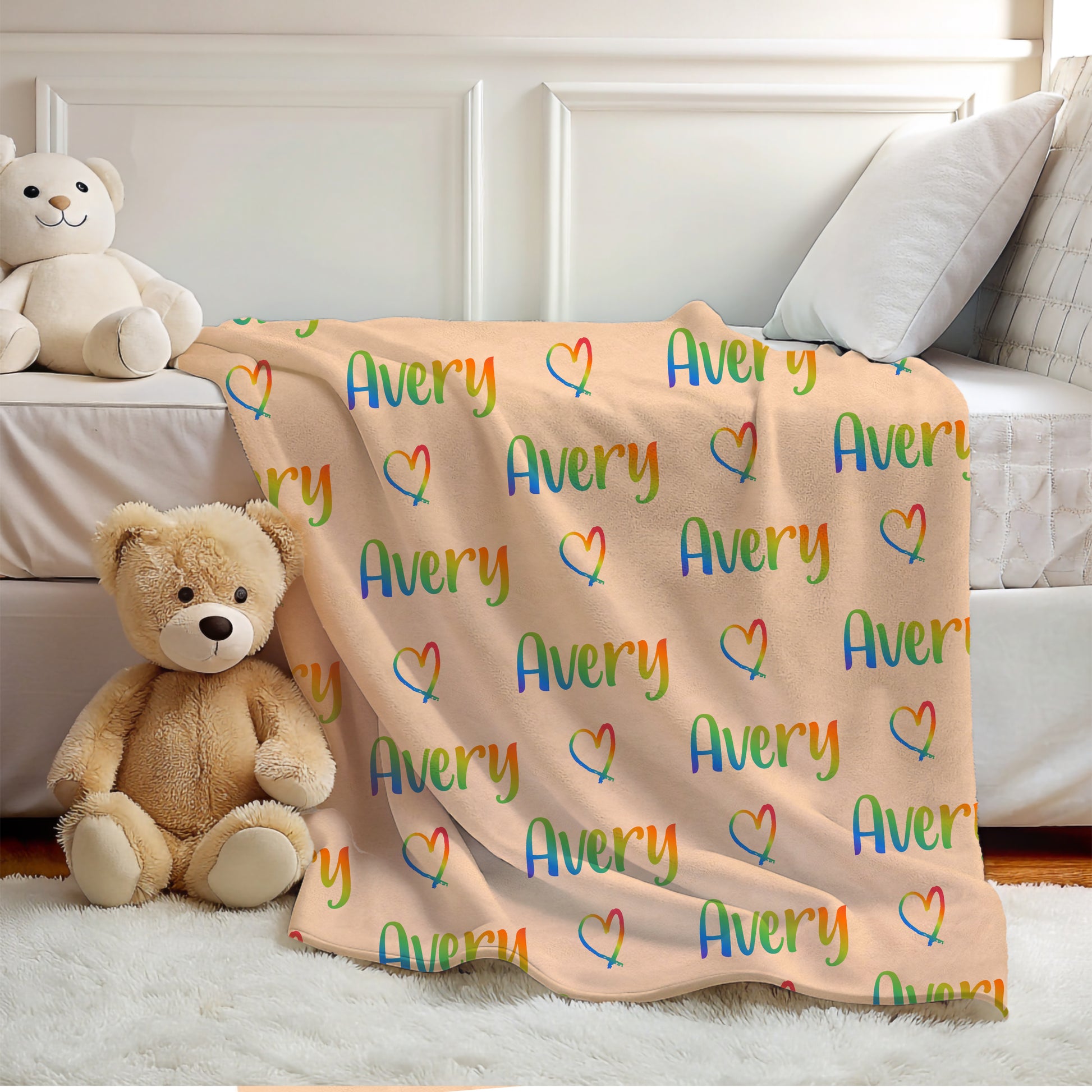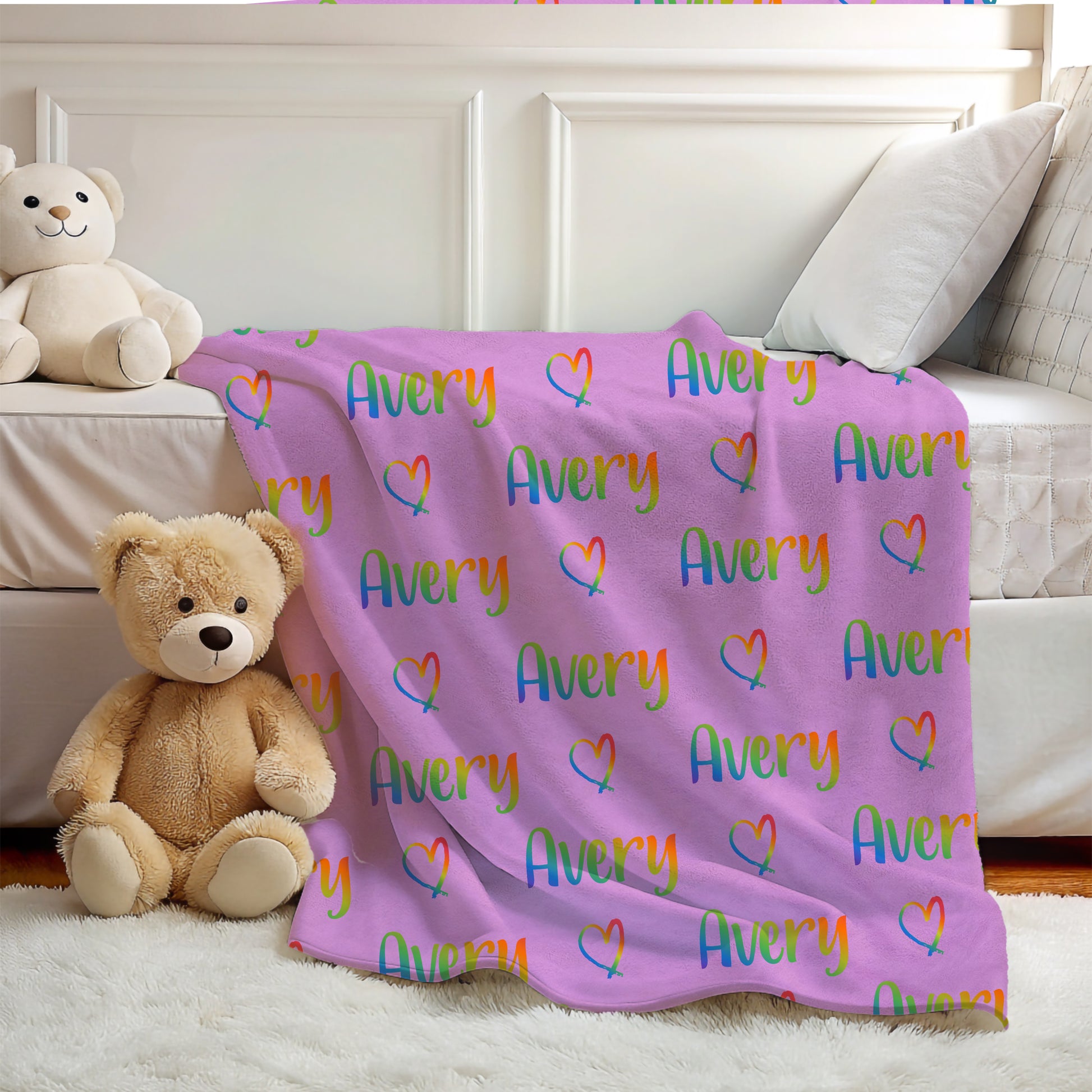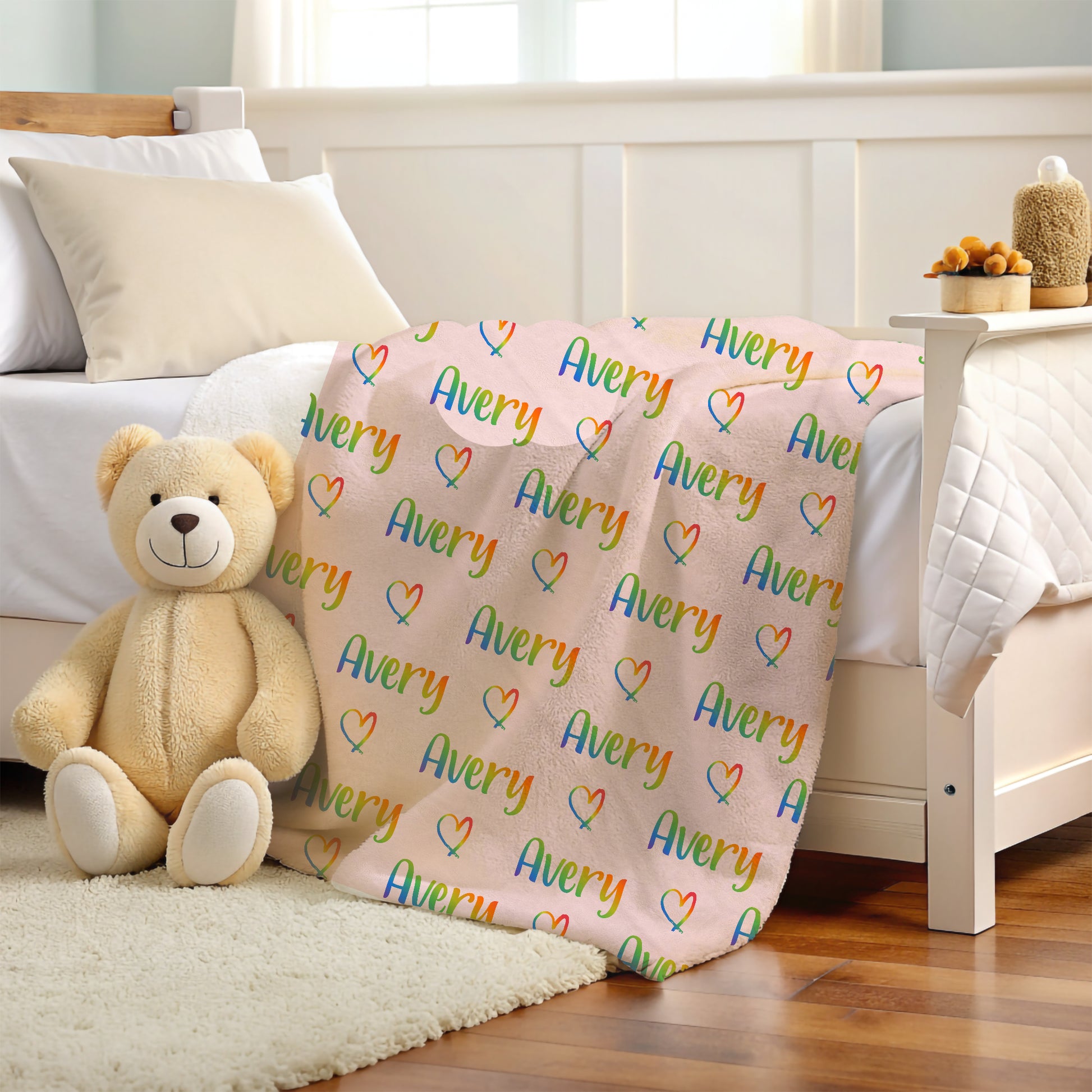 Add color and warmth to your child's room with this personalized rainbow name blanket, perfect for boys and girls who love vibrant colors and cozy snuggles.