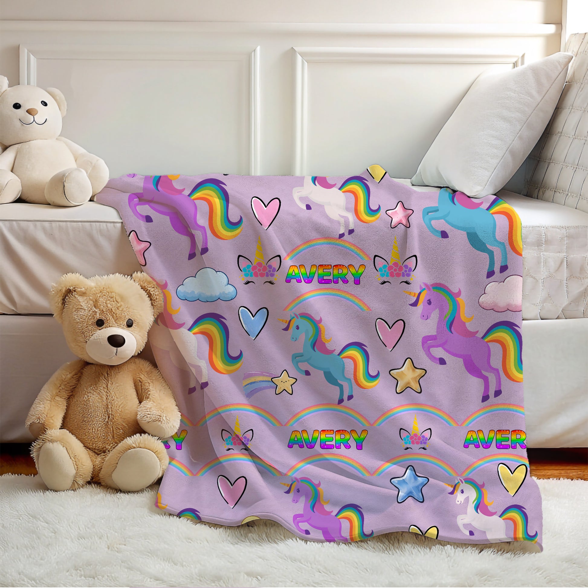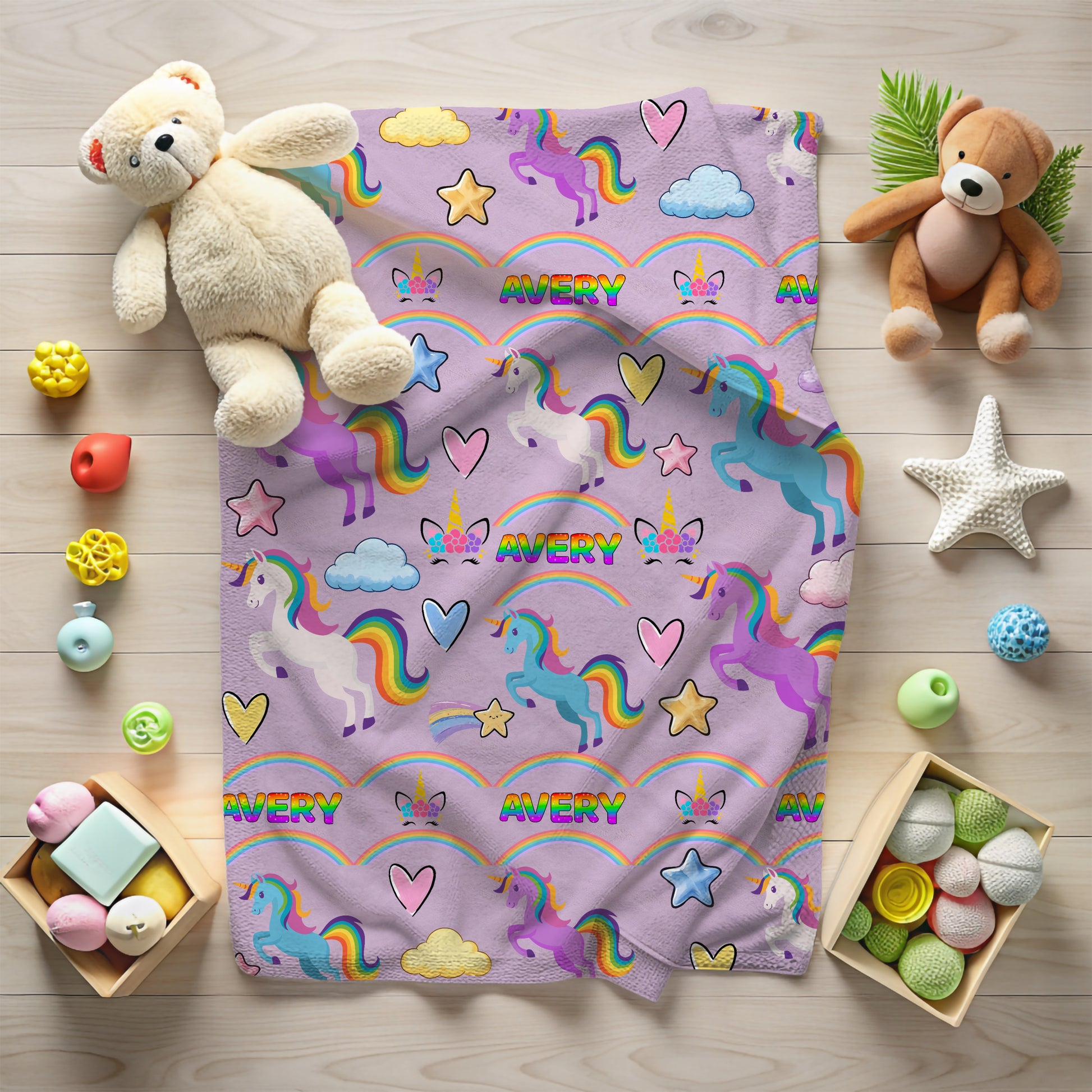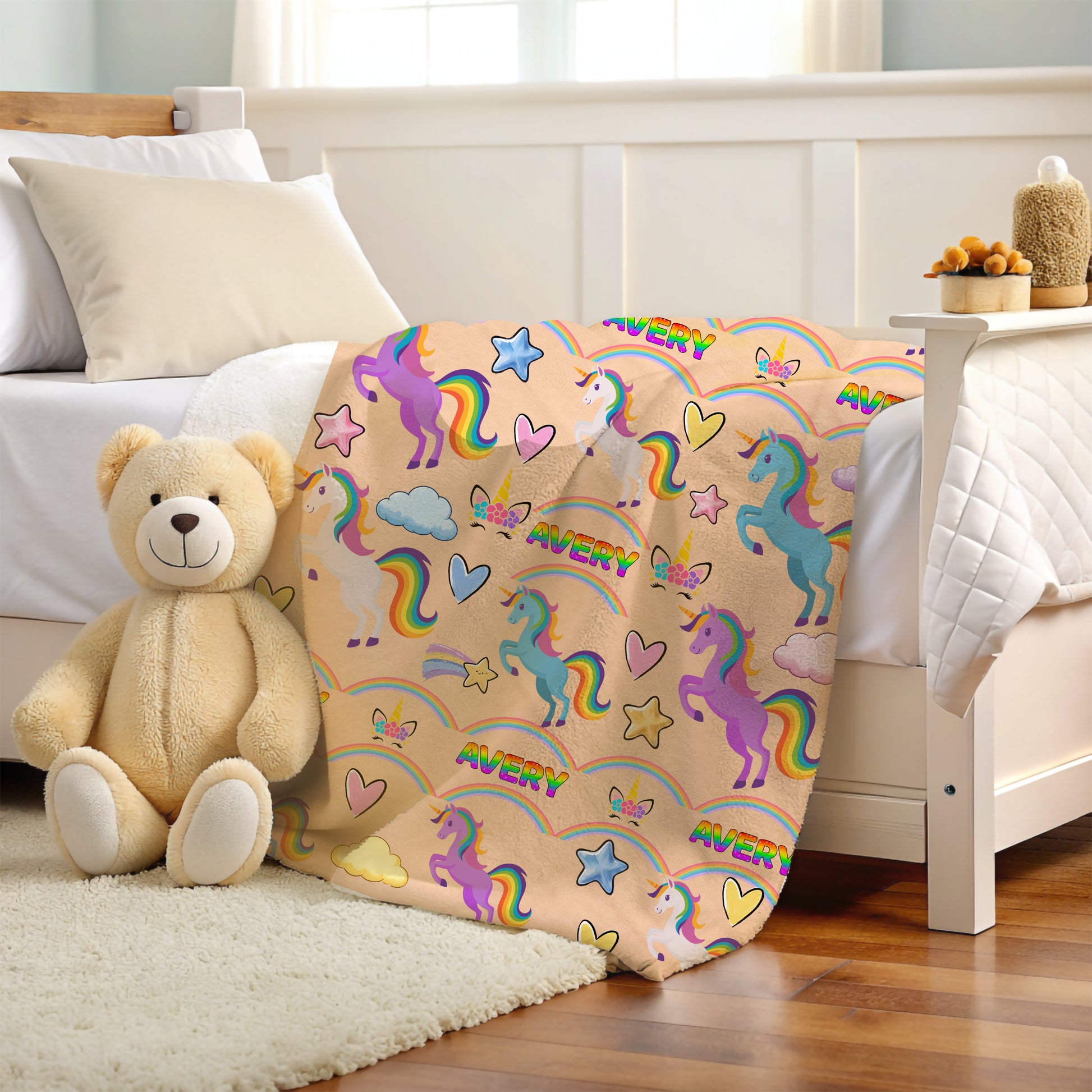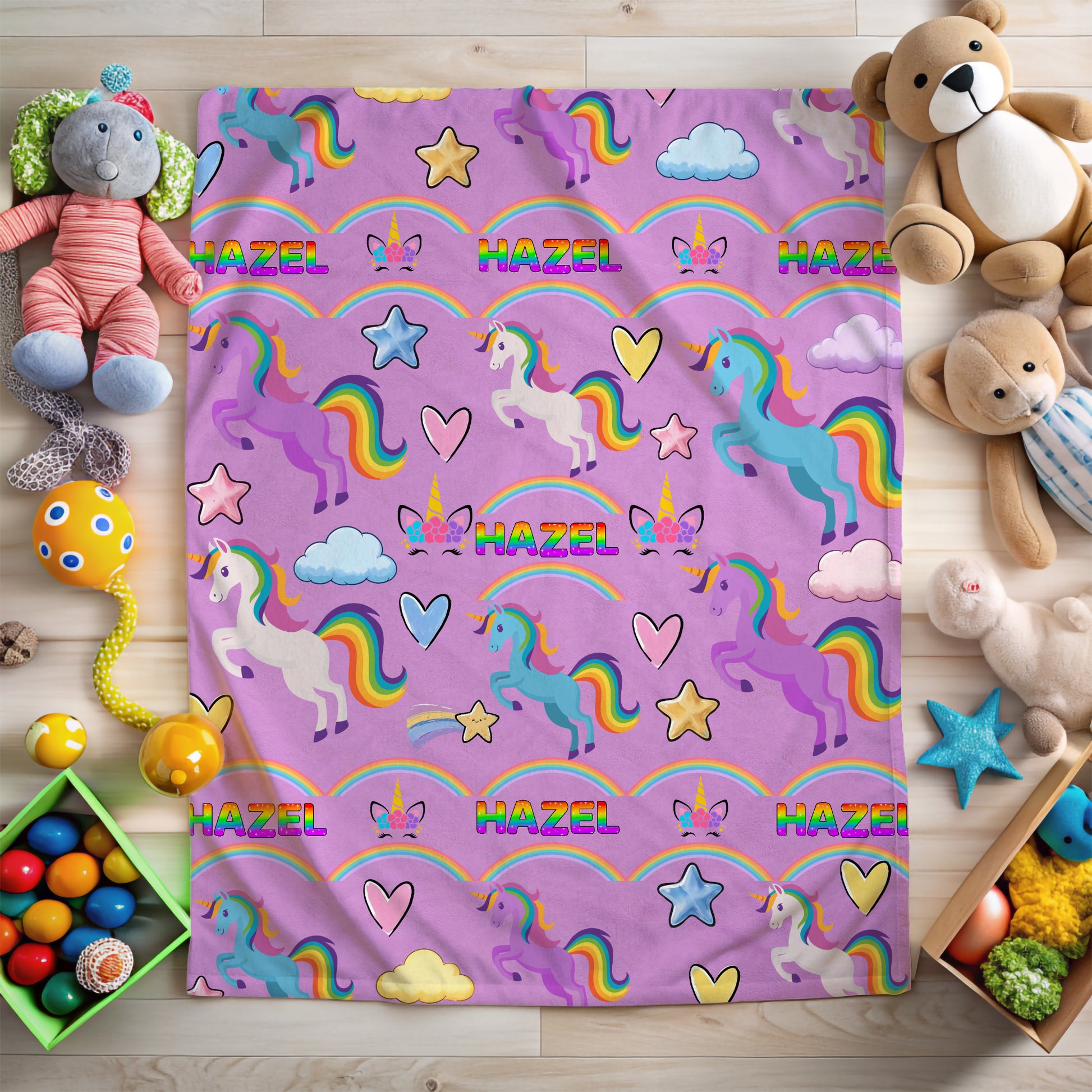 Add magic and warmth to your child's room with this personalized rainbow unicorn blanket, perfect for little dreamers who love unicorns, rainbows, and cozy snuggles.