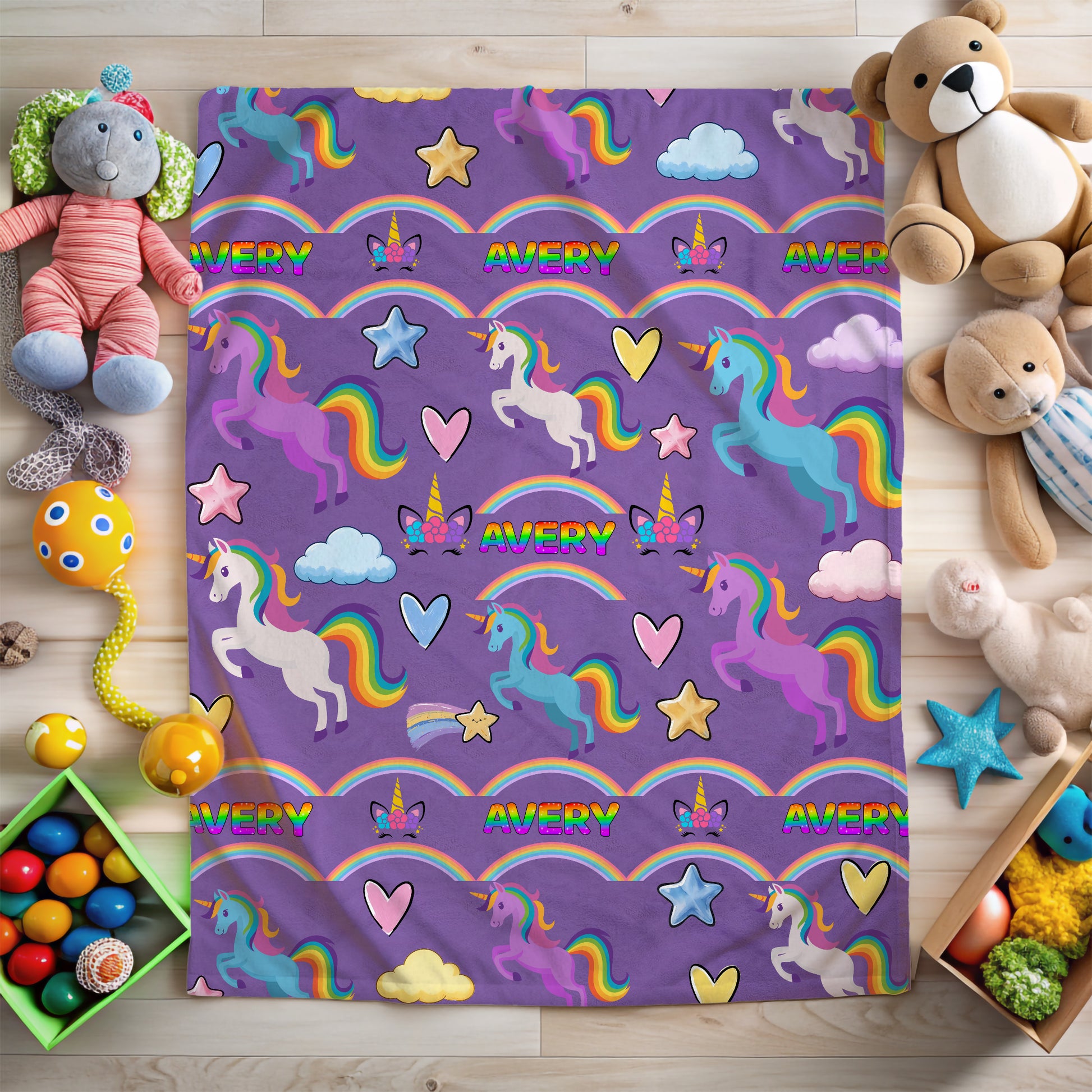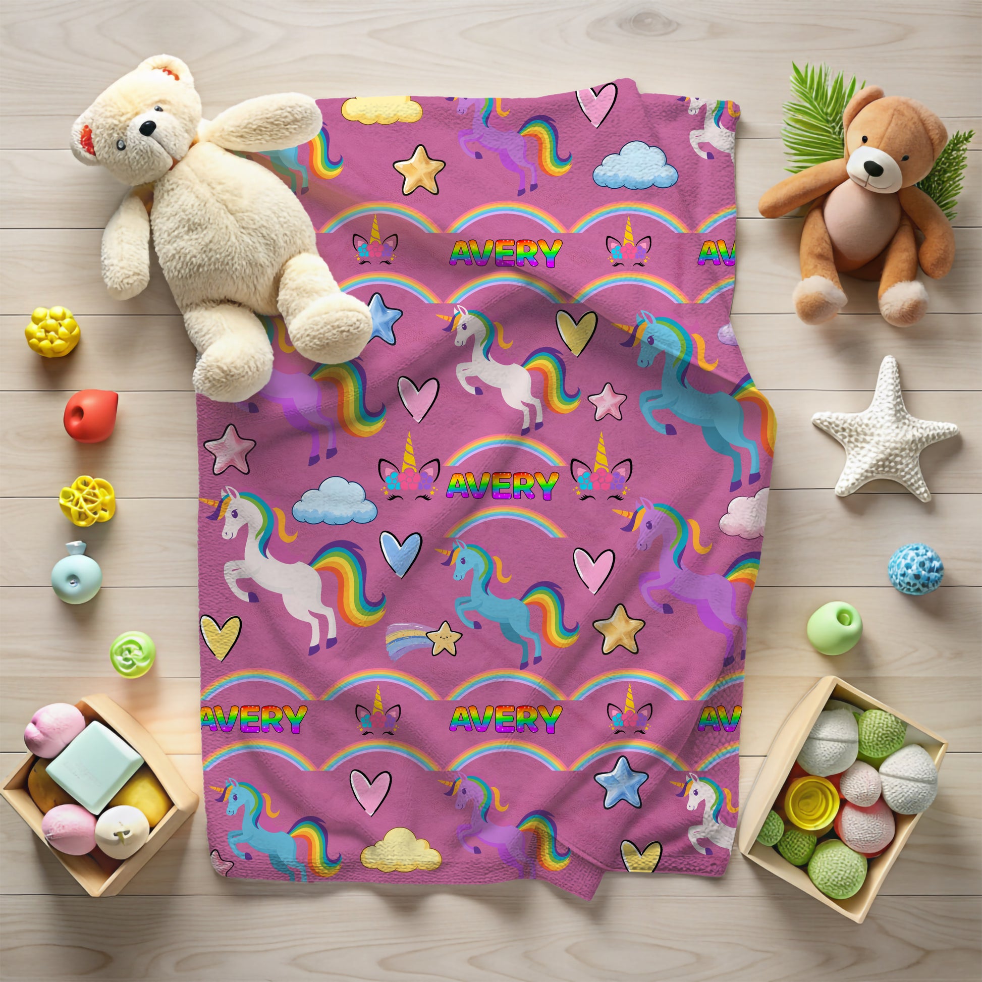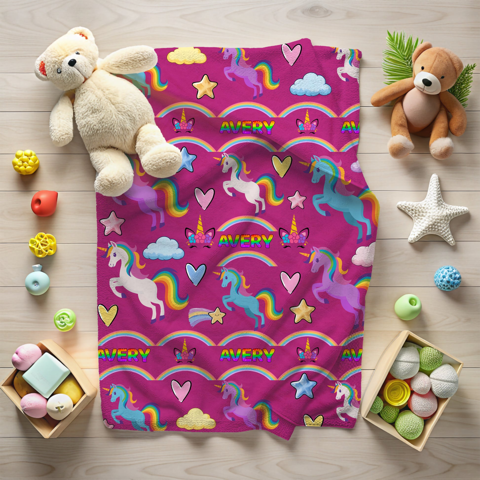 Add magic and warmth to your child's room with this personalized rainbow unicorn blanket, perfect for little dreamers who love unicorns, rainbows, and cozy snuggles.