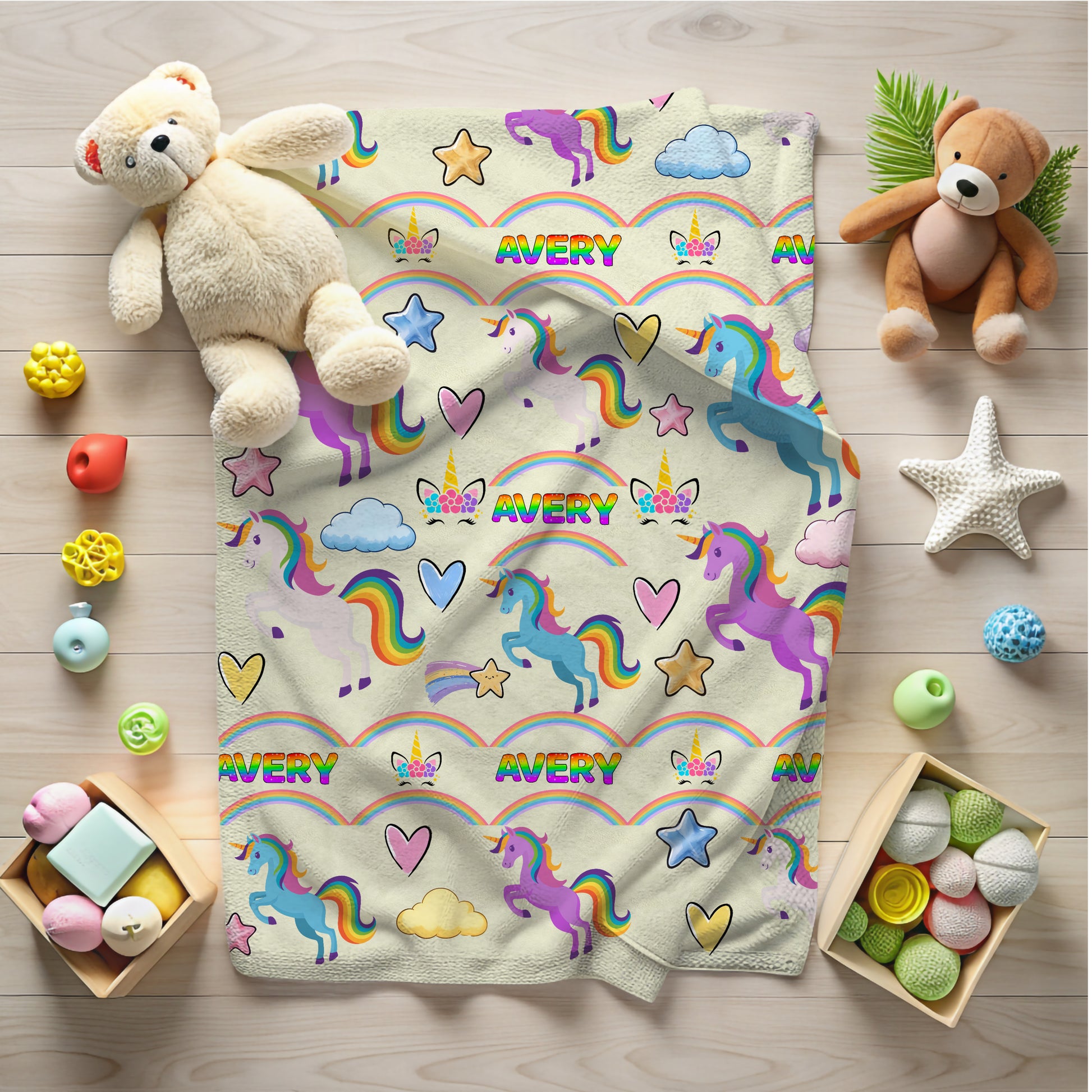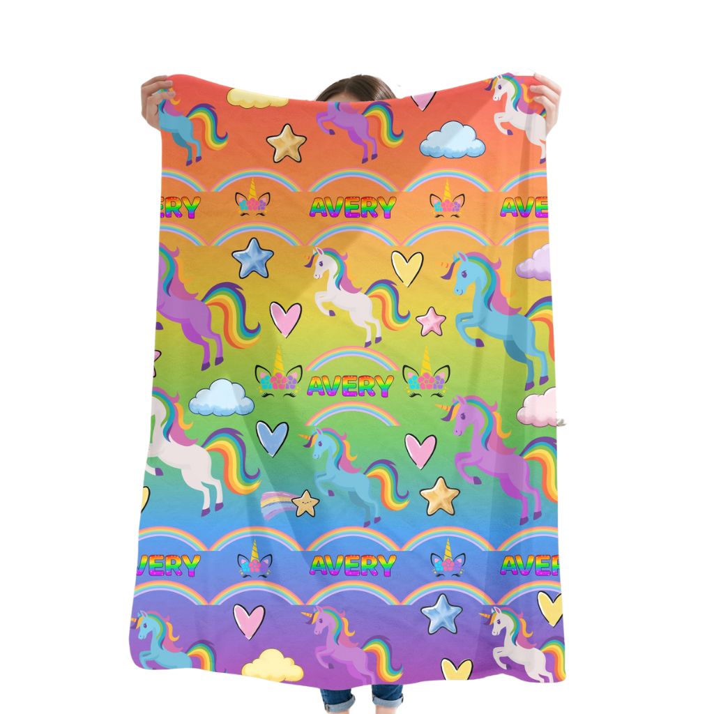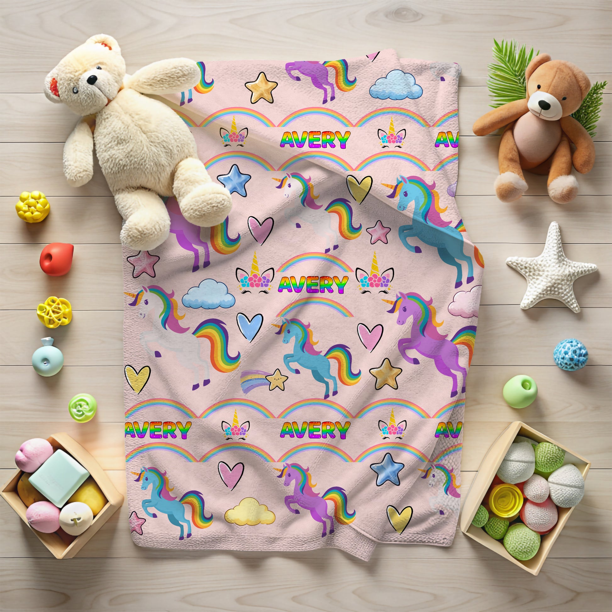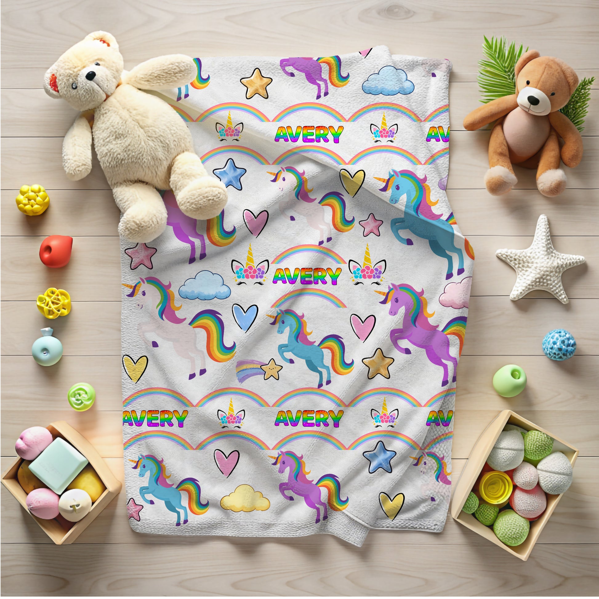 Add magic and warmth to your child's room with this personalized rainbow unicorn blanket, perfect for little dreamers who love unicorns, rainbows, and cozy snuggles.